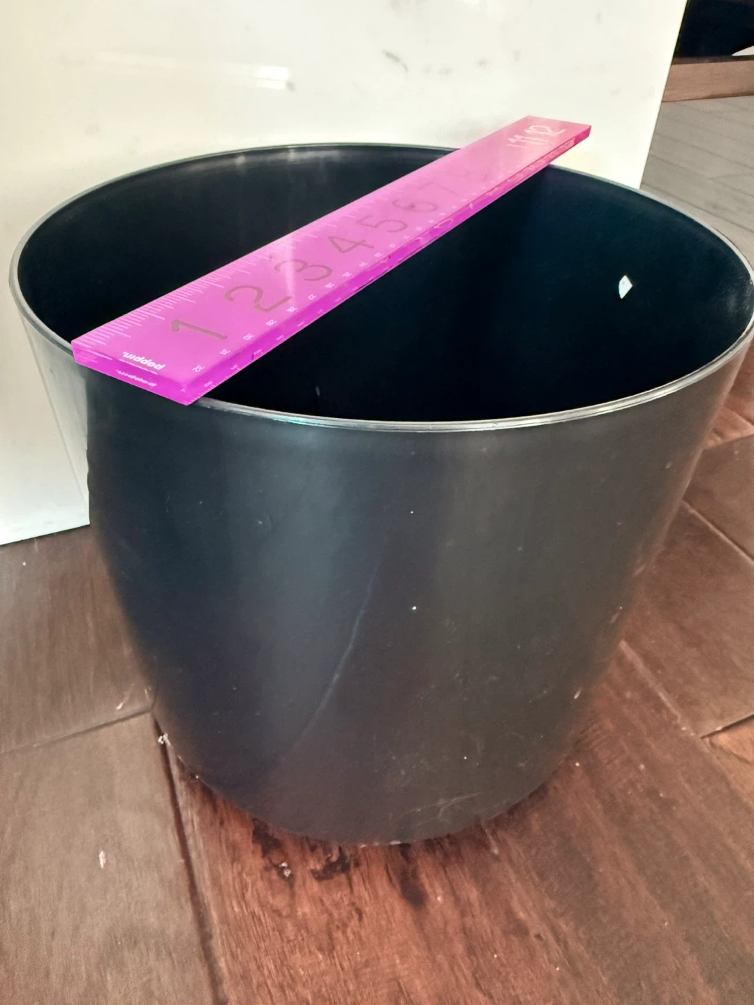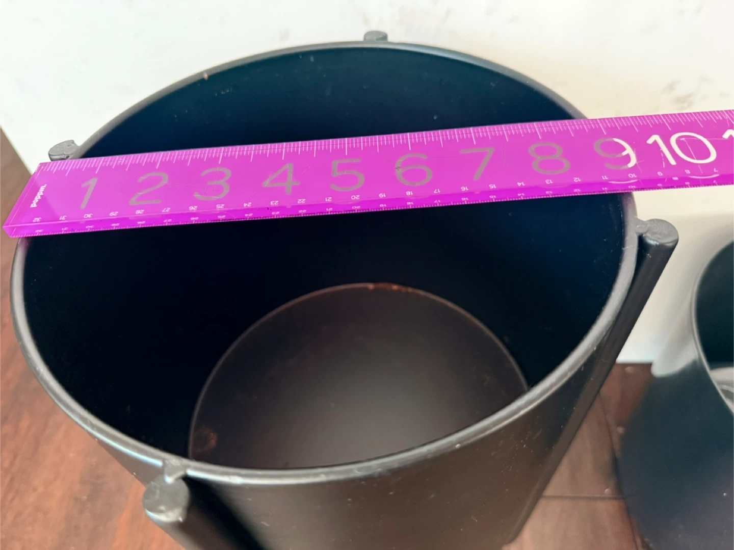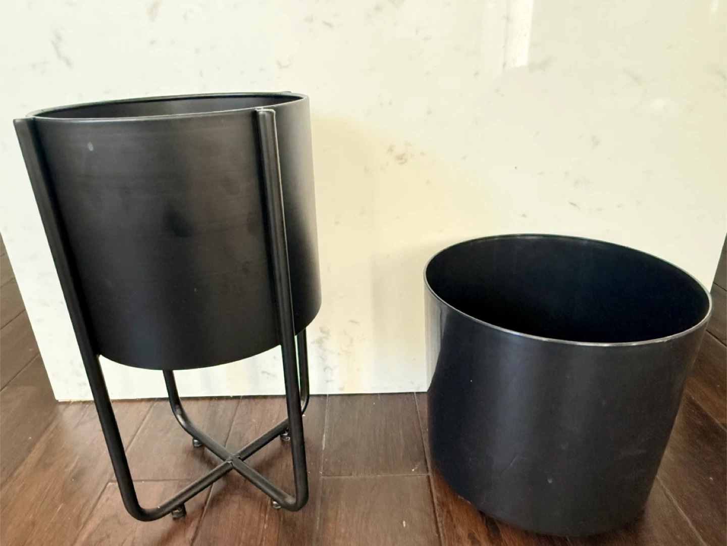 Two black planters, one with a stand metal planter . The larger planter measures approximately 10 inches in diameter and 9 inches tall. The smaller planter measures approximately 8 inches in diameter and 7 inches tall. These are sturdy and stylish pots for your houseplants!