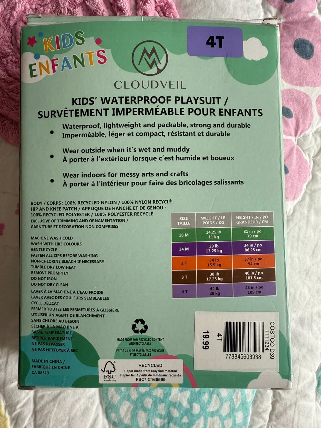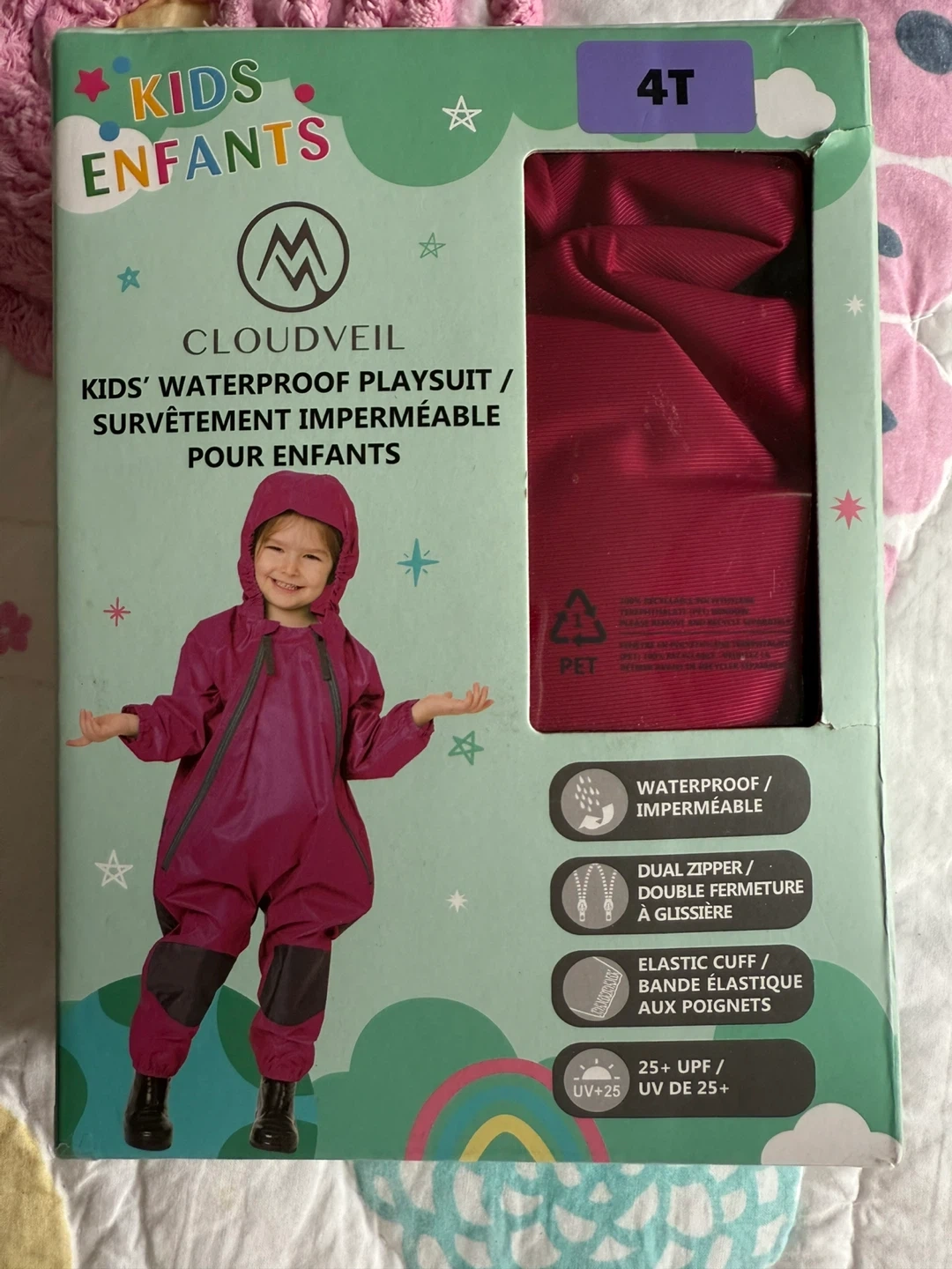 This Cloudveil kids' waterproof playsuit is designed for adventure. It's waterproof, lightweight, packable, strong, and durable. Body is 100% recycled nylon with a 100% recycled polyester lining. Machine wash cold with like colours.