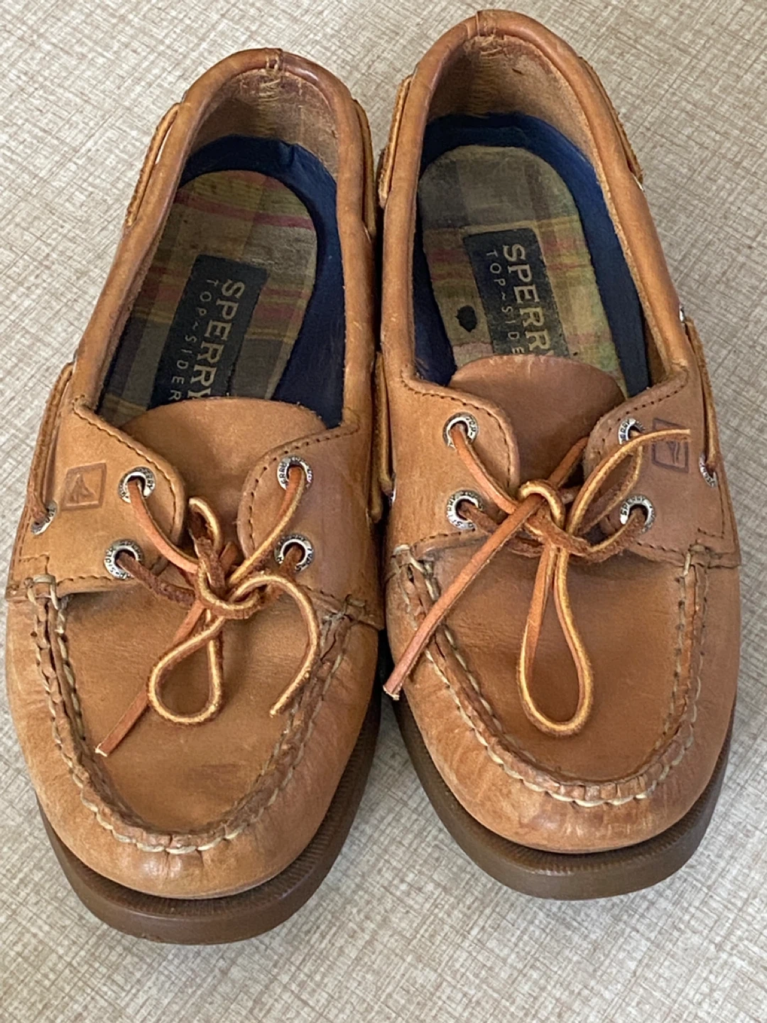 These are classic brown leather Sperry Top-Sider boat shoes. They feature a traditional lace-up design with metal eyelets. Made from durable leather, perfect for casual wear.