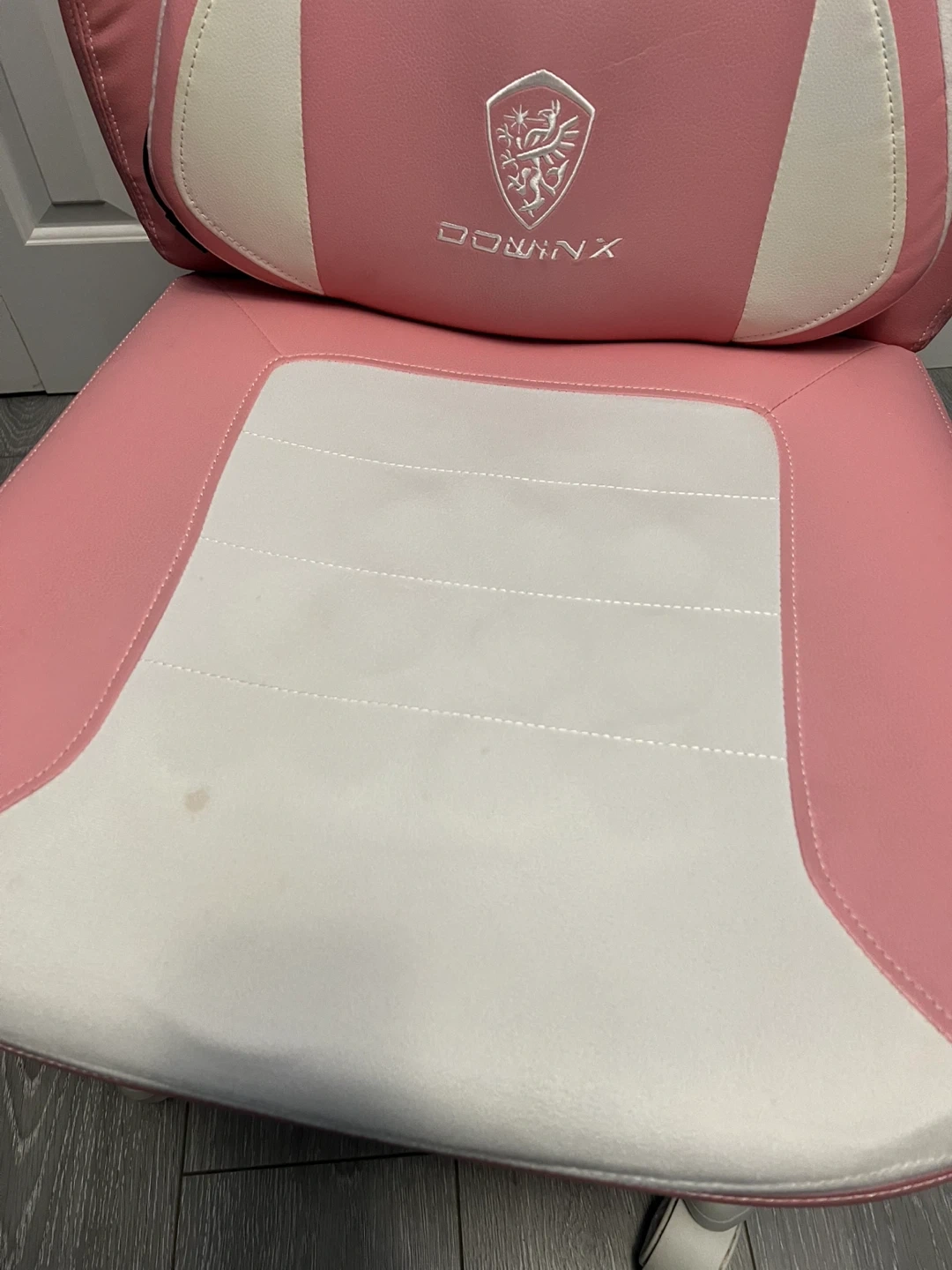 Selling a Dowinx gaming chair in pink and white! It has a headrest and lumbar support for extra comfort during those long gaming sessions. There are a few small stains on the seat, but otherwise it's in good condition. Perfect for any gamer looking to add a pop of colour to their setup