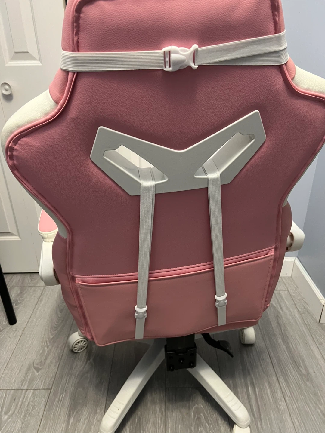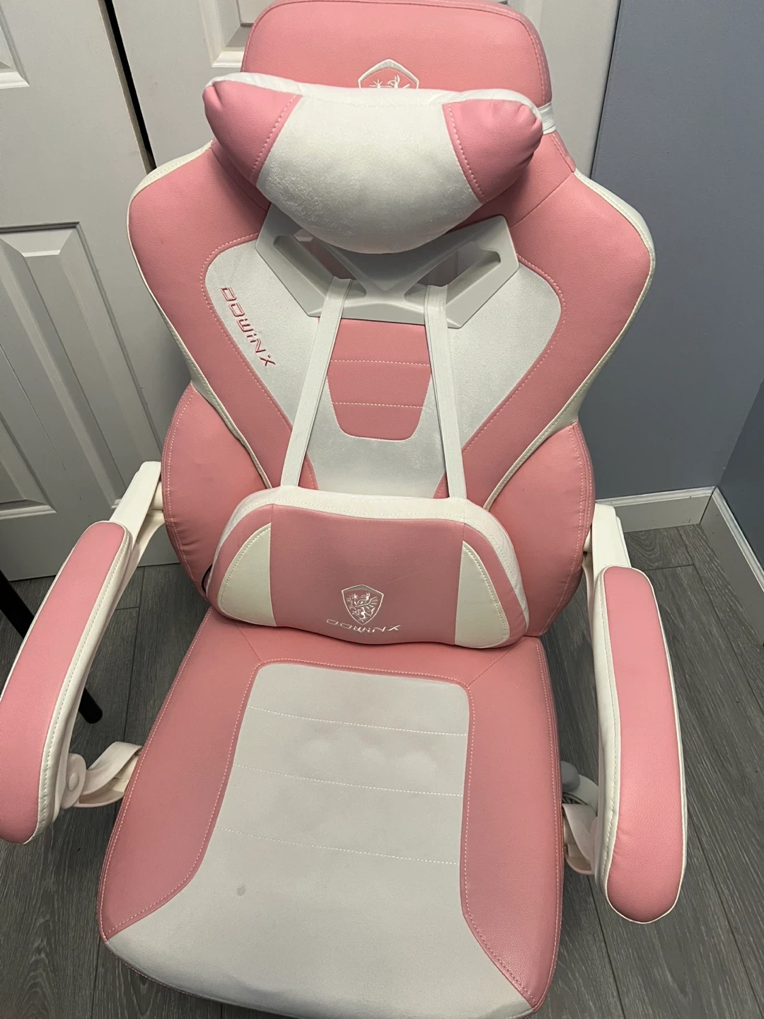 Selling a Dowinx gaming chair in pink and white! It has a headrest and lumbar support for extra comfort during those long gaming sessions. There are a few small stains on the seat, but otherwise it's in good condition. Perfect for any gamer looking to add a pop of colour to their setup