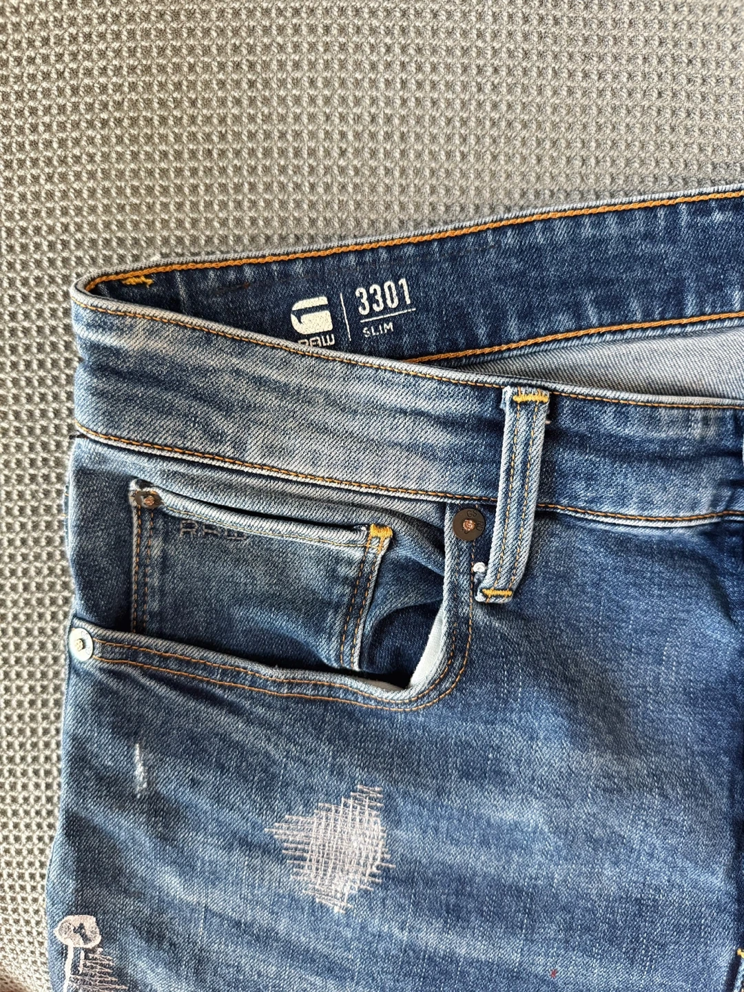 💎 Original G-Star RAW jeans, 3301 Slim model with subtle worn details and designer accents. Stylish and modern, suitable for both everyday outfits and casual occasions.