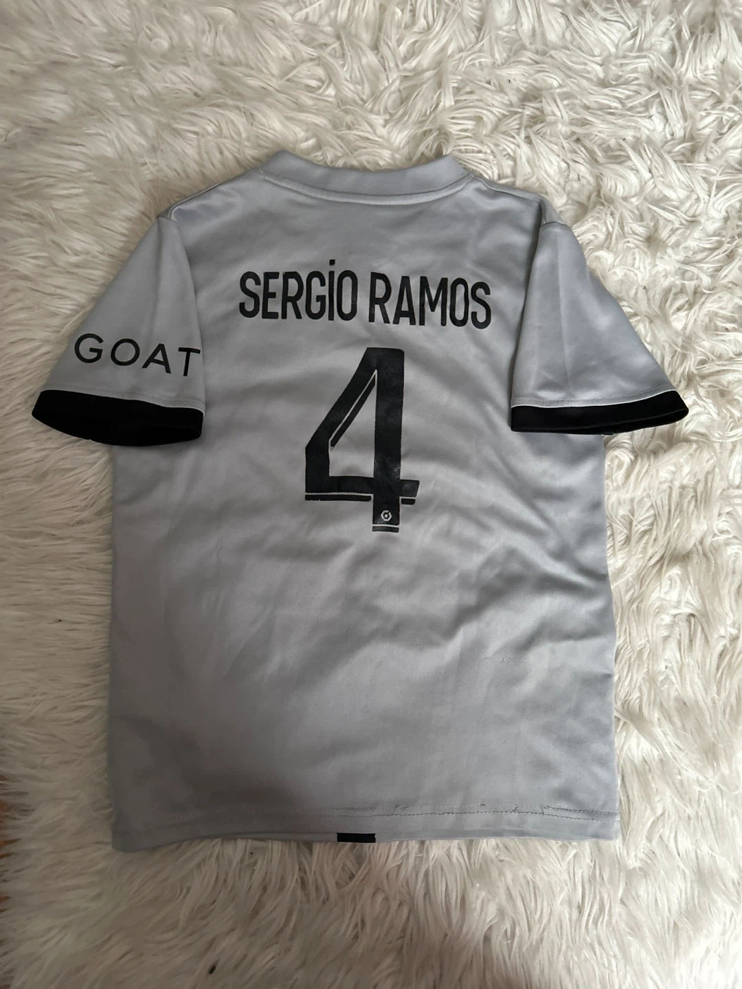 This is a Paris Saint-Germain jersey and shorts set featuring Sergio Ramos' name and number 4. It includes a pair of grey socks. Great for any young fan of PSG!