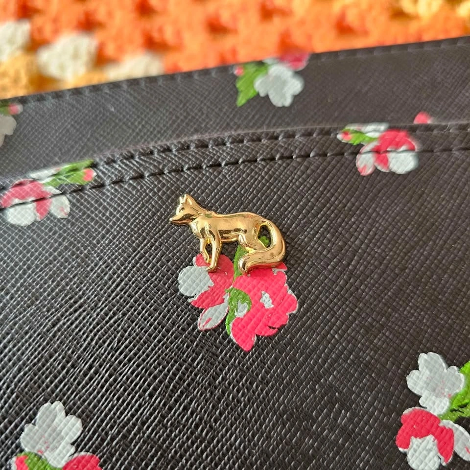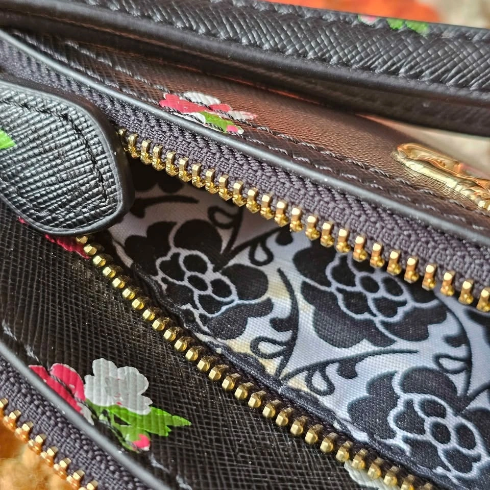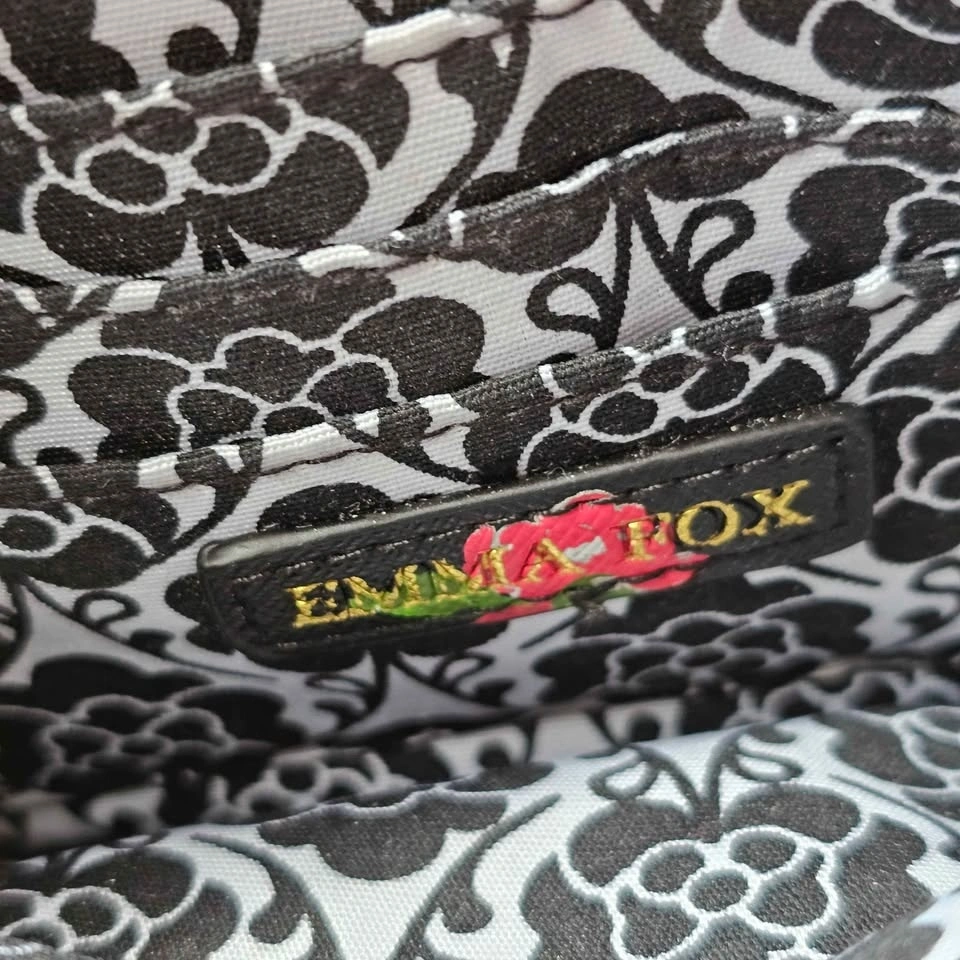Chic black faux leather wristlet bag from Emma Fox, featuring a red, green, white and grey tropical floral pattern. Bag has gold tone hardware and Emma Fox's signature fox charm on the front. Lining is done in a white and black floral print contrast material.