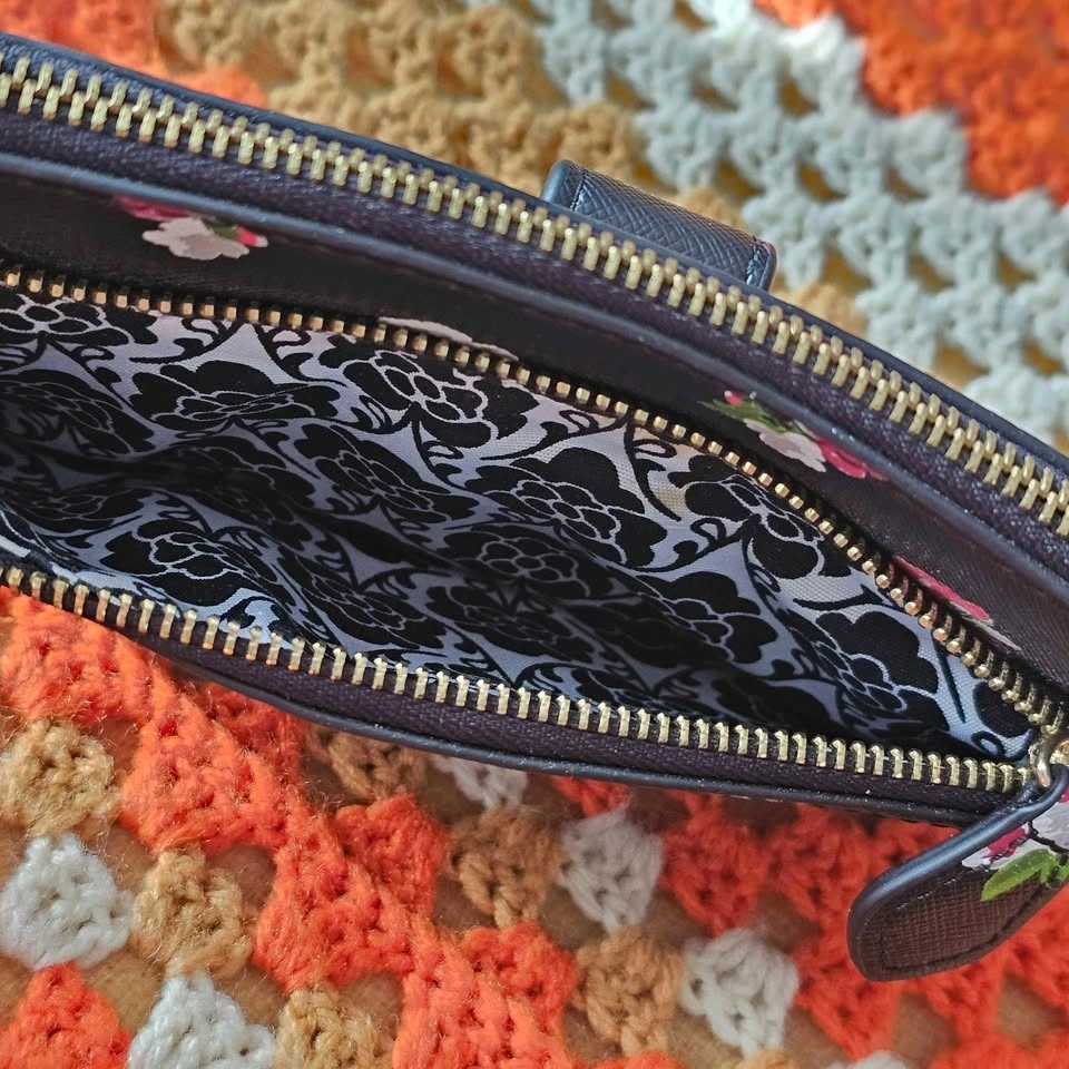 Bag is in fantastic condition and looks like new from the outside. There is one area with some discoloration on the inner lining in the front zippered pocket, please see final photo for detail. Bag measures about 8.75" long x 5.75" tall x 1" wide.