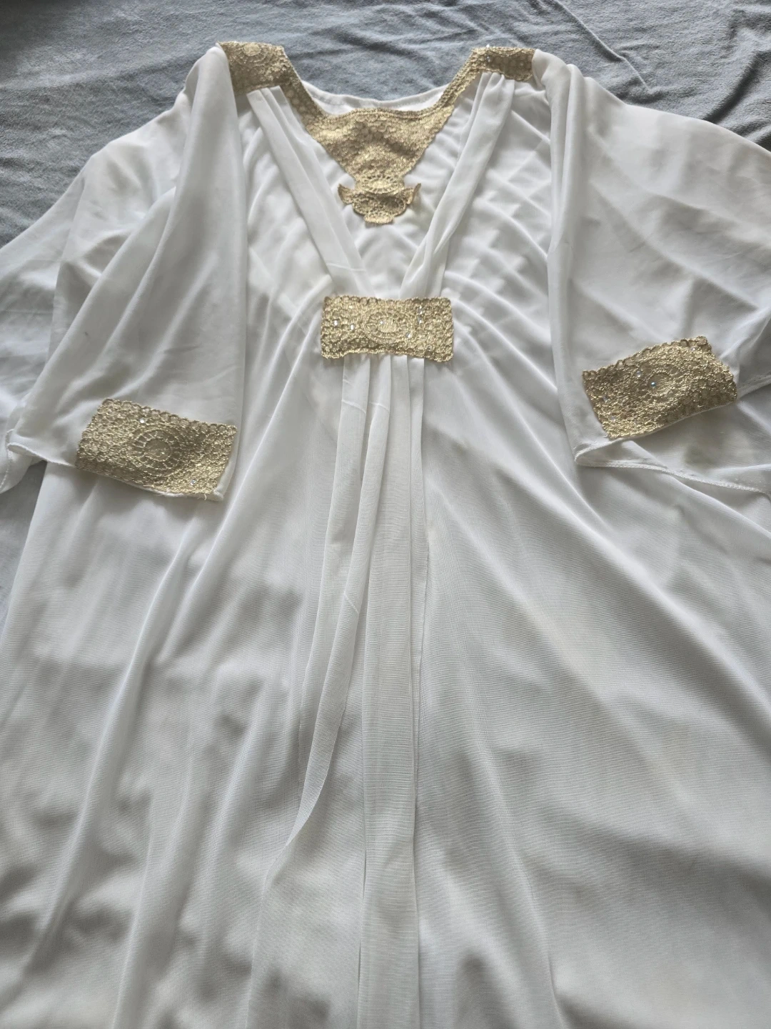 A flowing white kaftan adorned with intricate gold lace and beadwork. This garment features a V-neckline with decorative gold trim and embellished cuffs. It's made of a lightweight, sheer fabric, perfect for warm weather occasions.