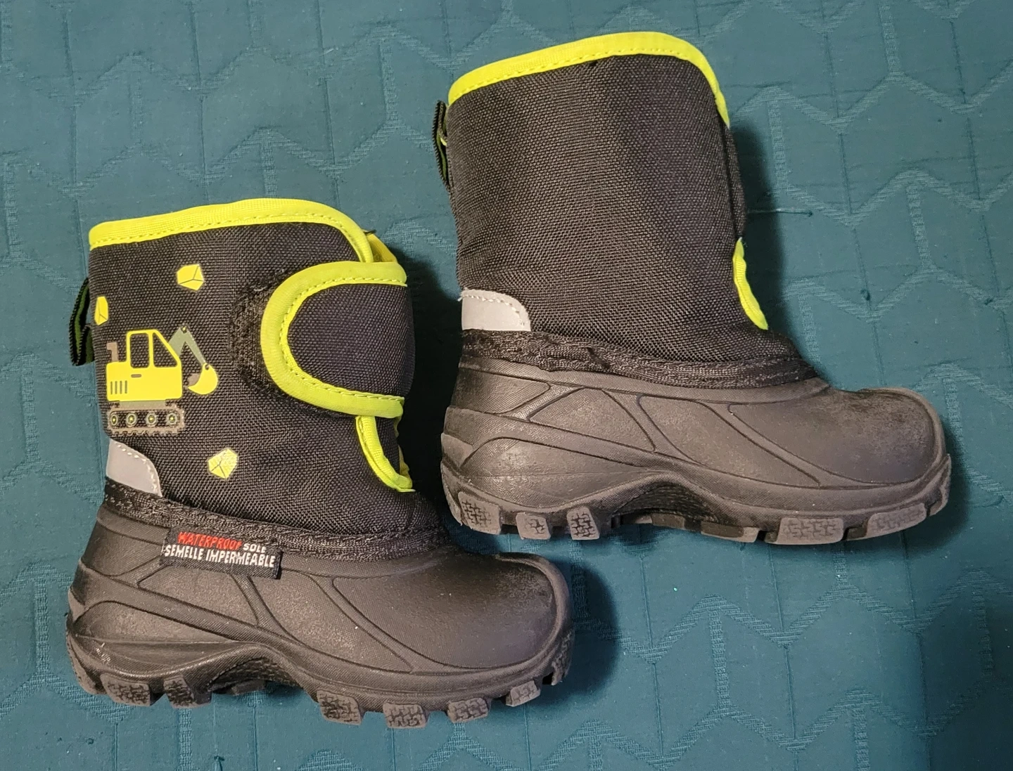 Black and neon yellow winter boots for kids. Waterproof construction with a digger graphic on the side. Features a hook-and-loop closure for easy on and off. Size is 5.