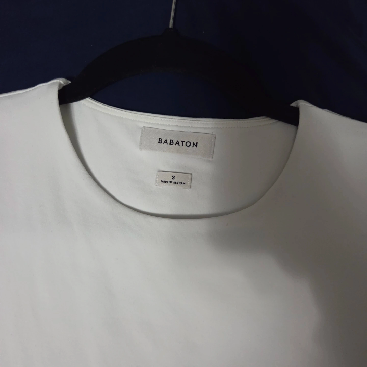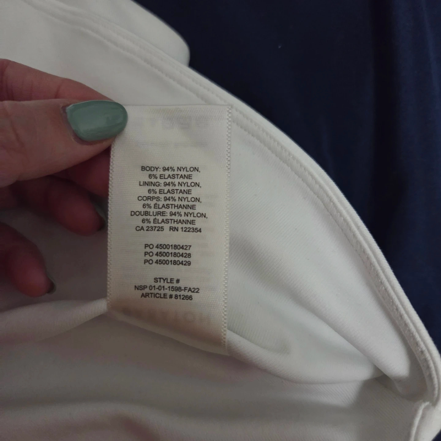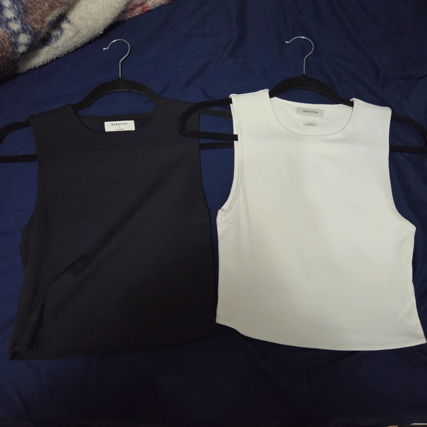 Two Babaton tank tops, one black and one white. They're made from a 94% nylon and 6% elastane blend. Size S.