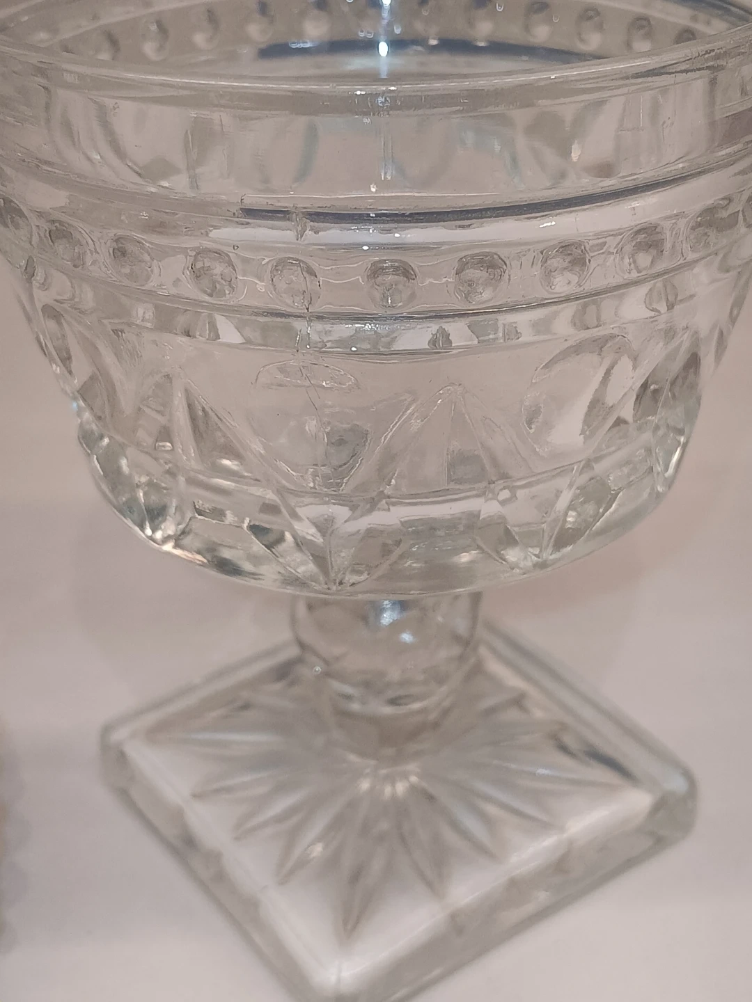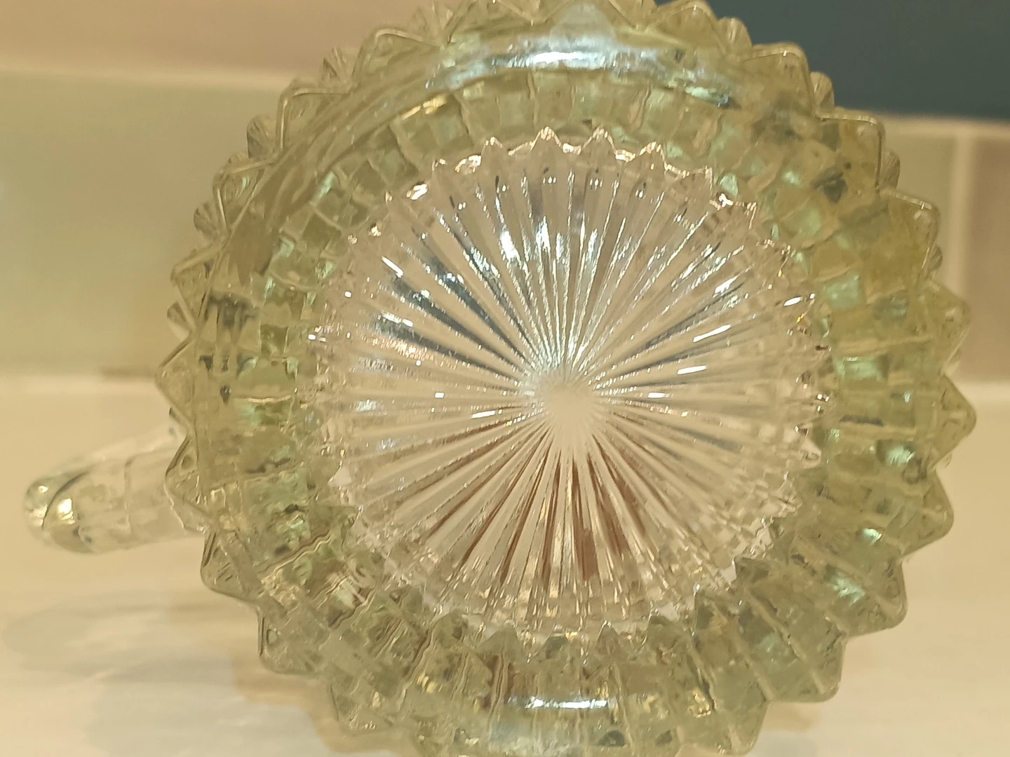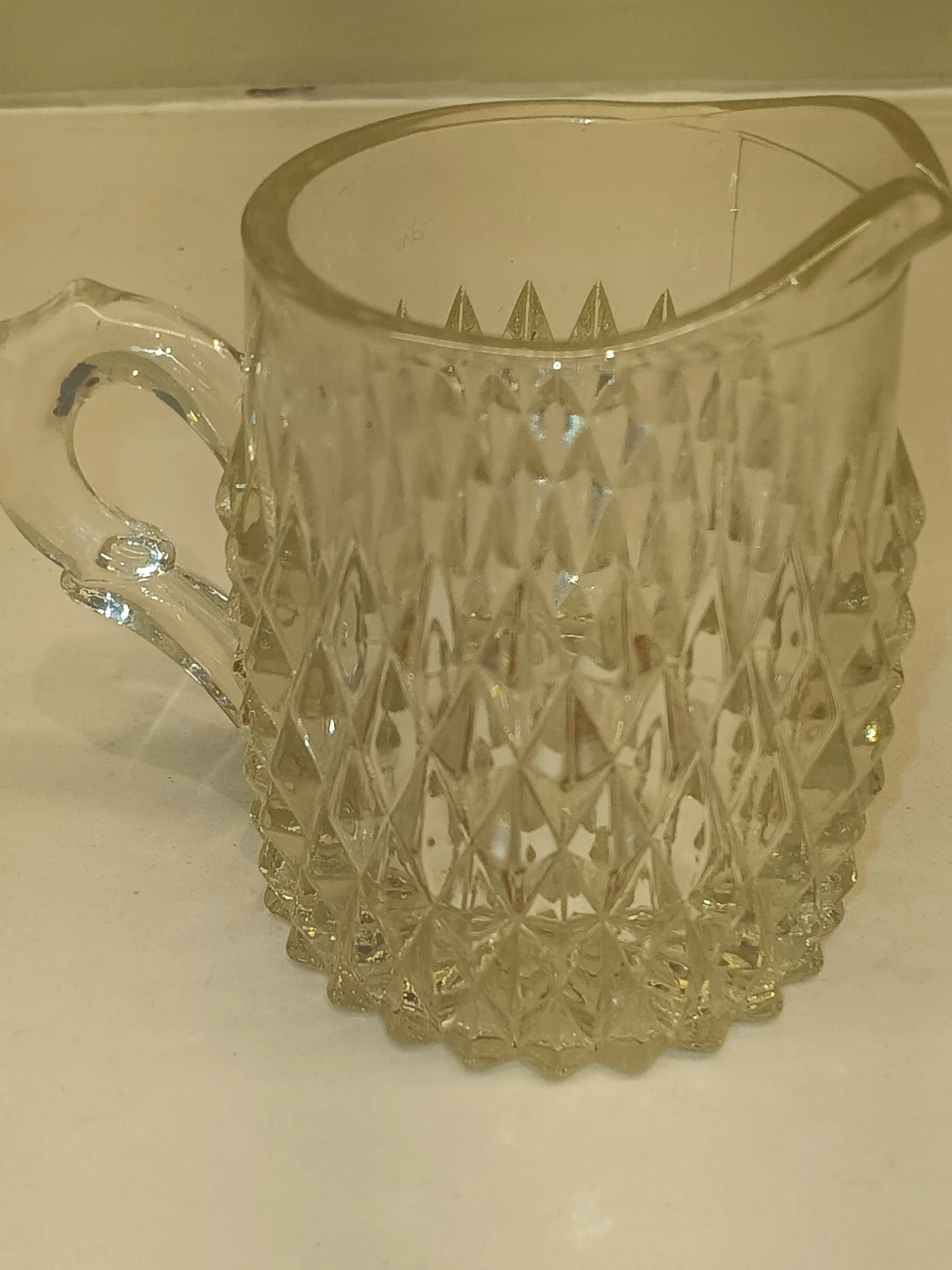 Selling a vintage Indiana Glass Diamond Point clear pressed glass miniature creamer and Vintage Colony Park Lane Goblet. Perfect for adding a touch of elegance to your table setting! Gift box and ribbon included.
