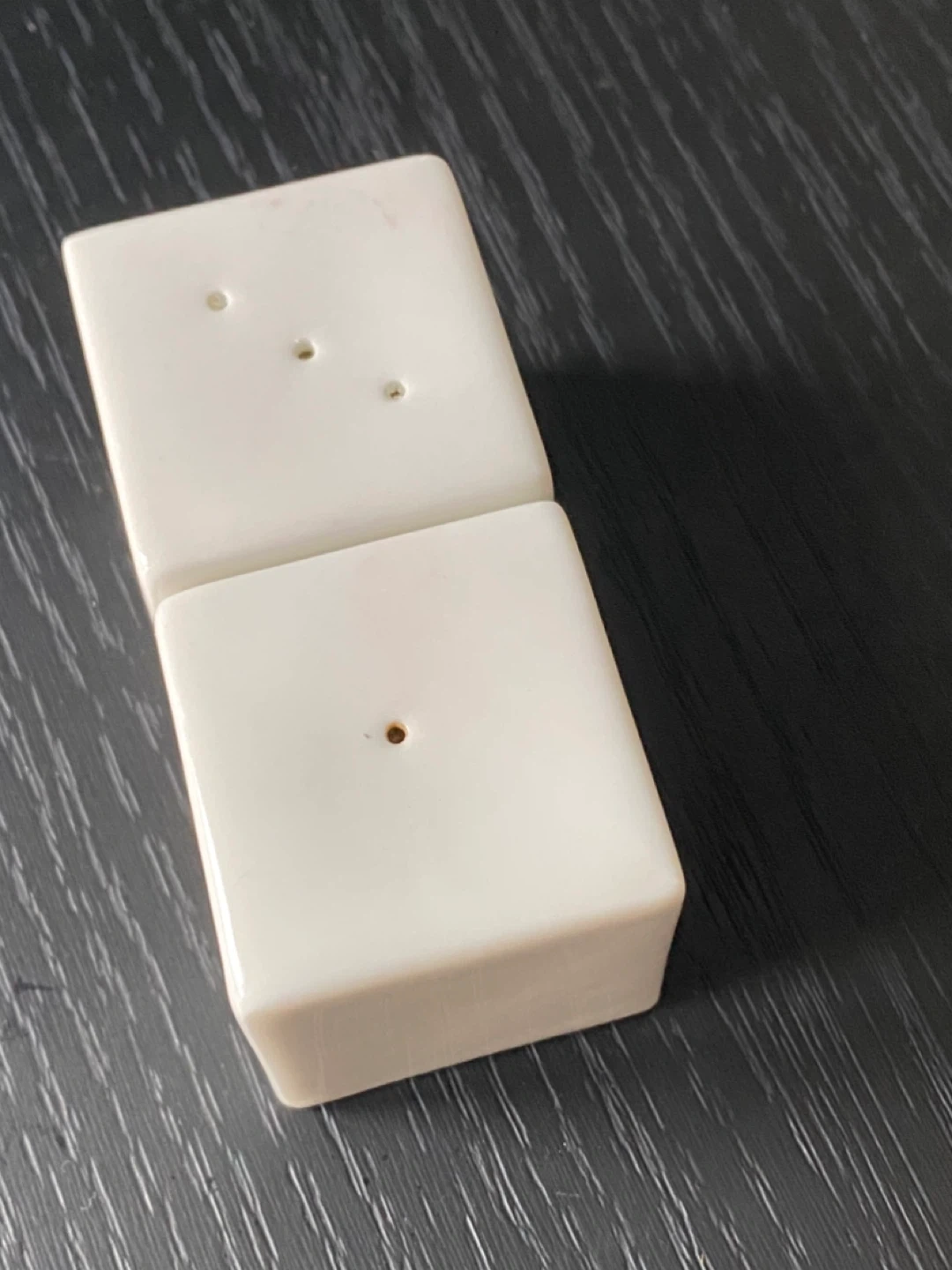 A set of two white ceramic cube-shaped salt and pepper shakers. These shakers are made of smooth ceramic material.