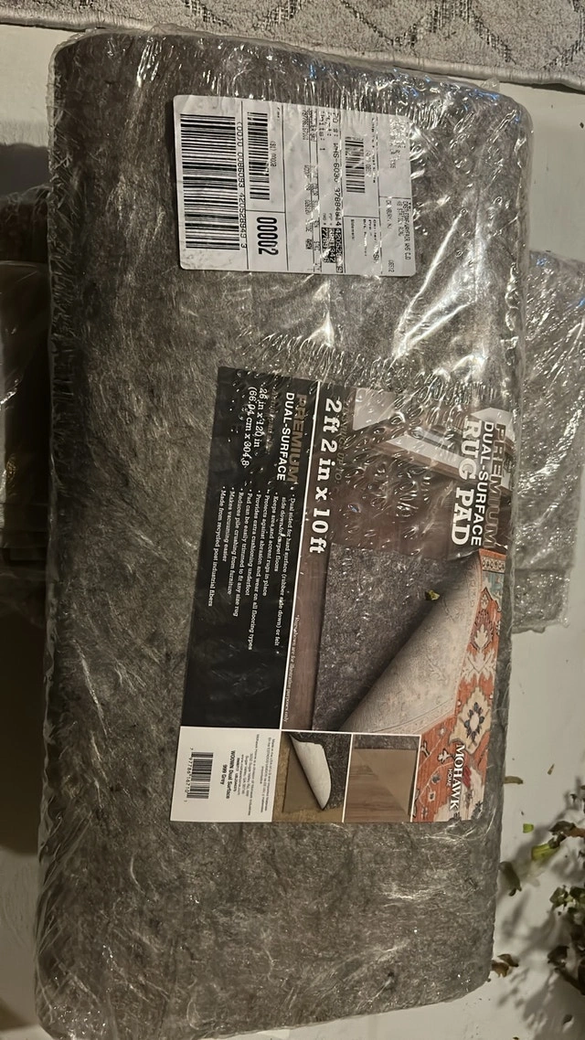 Mohawk Home Premium Dual-Surface Rug Pad. This pad offers cushioning and prevents slippage for rugs on both hard and carpeted floors. It's designed to protect against abrasion, reduce pile crushing, and make vacuuming easier. This item is new, still sealed in its original packaging.