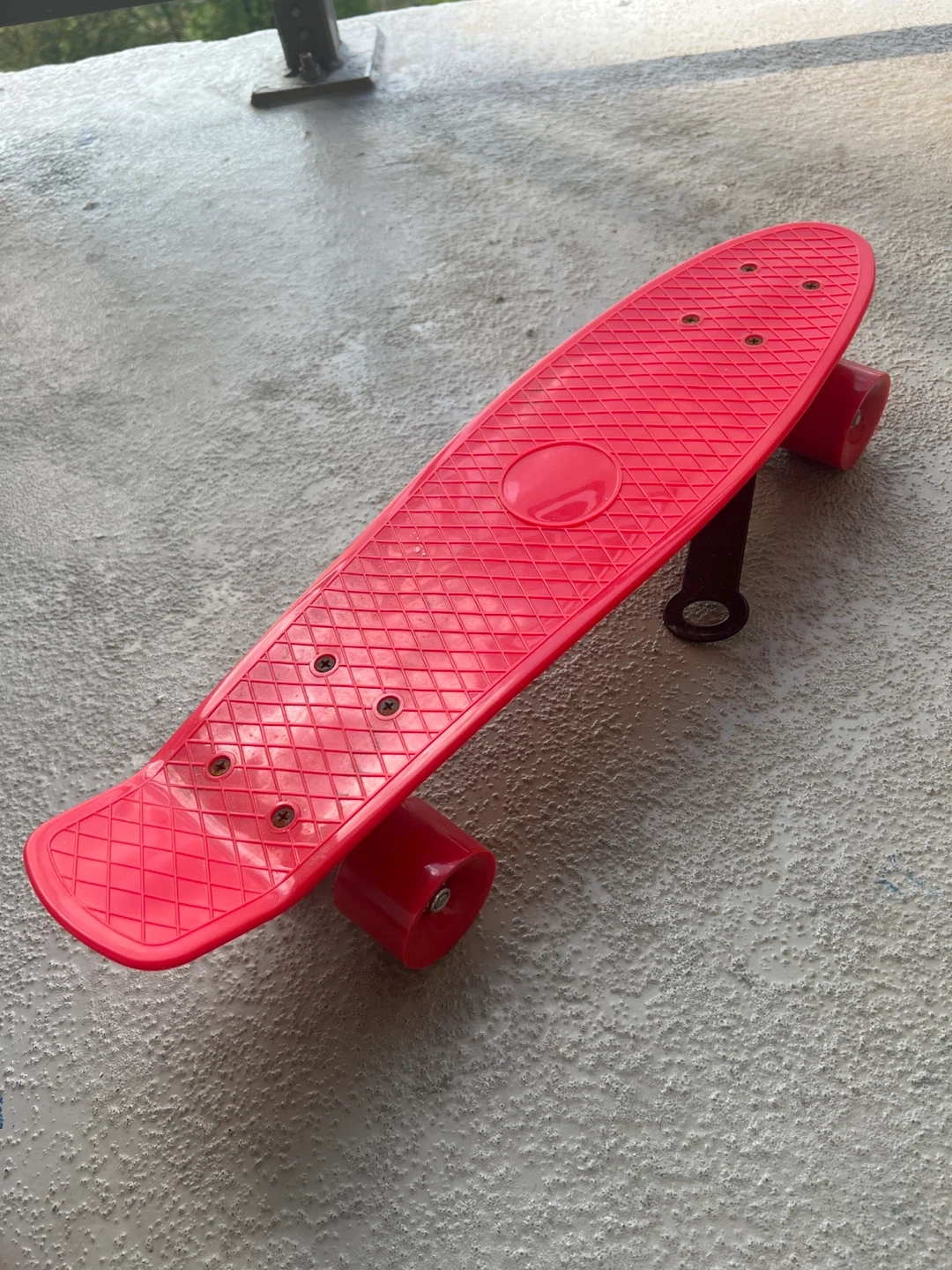 Selling a red penny board skateboard! It's in good condition and ready to ride. Perfect for cruising around town or learning some new tricks