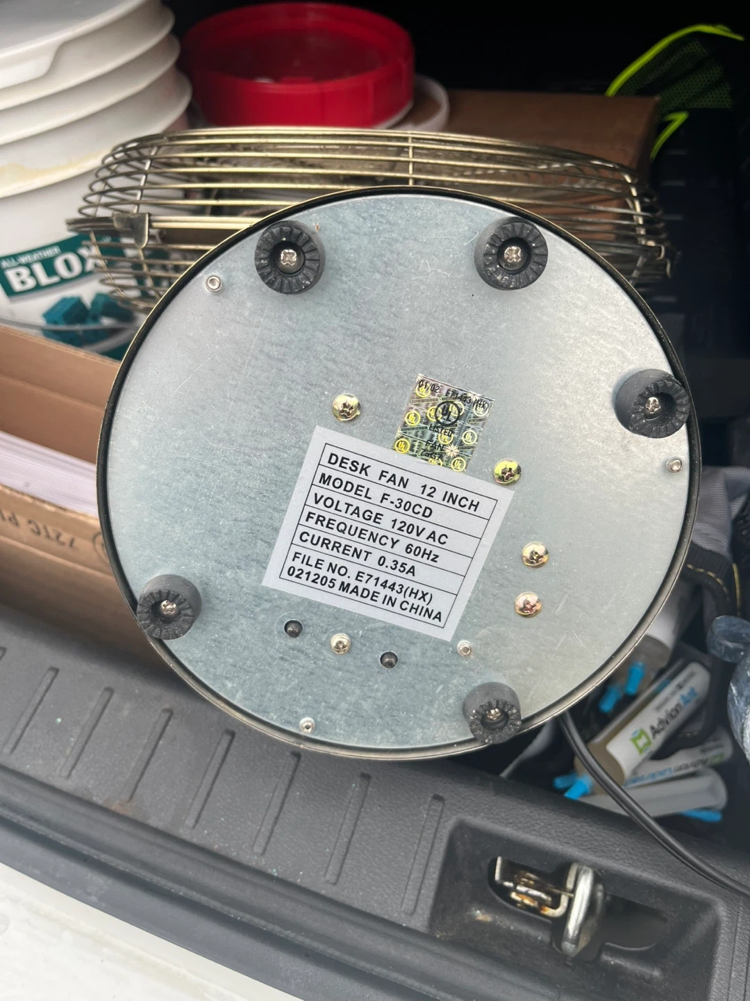 This is a Cool-Breeze desk fan with a 12-inch diameter. It features a brass-toned finish and multiple speed settings labeled 0, I, II, and III. The fan operates on 120V AC with a current of 0.35A.