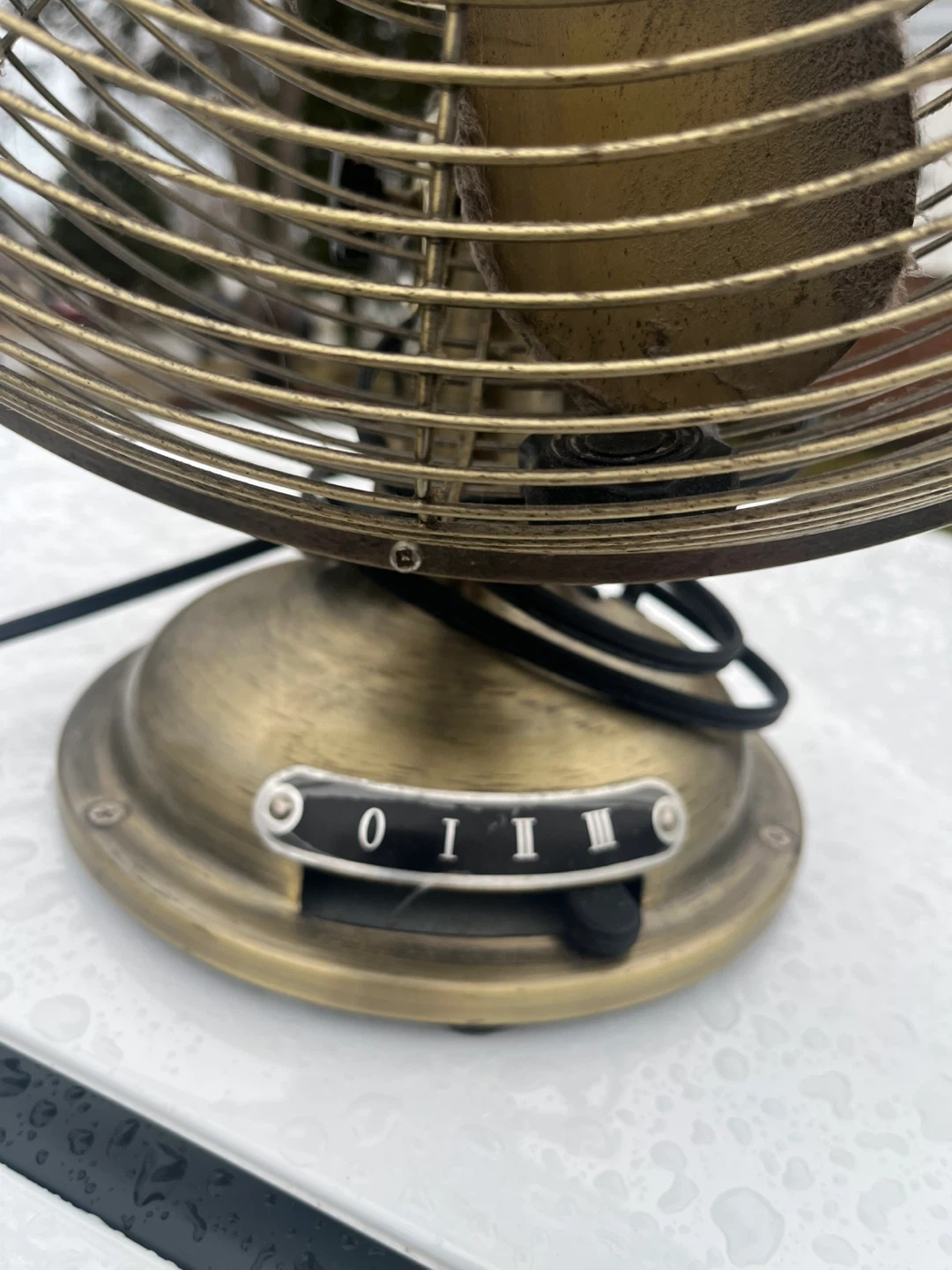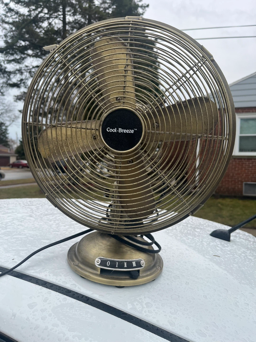 This is a Cool-Breeze desk fan with a 12-inch diameter. It features a brass-toned finish and multiple speed settings labeled 0, I, II, and III. The fan operates on 120V AC with a current of 0.35A.
