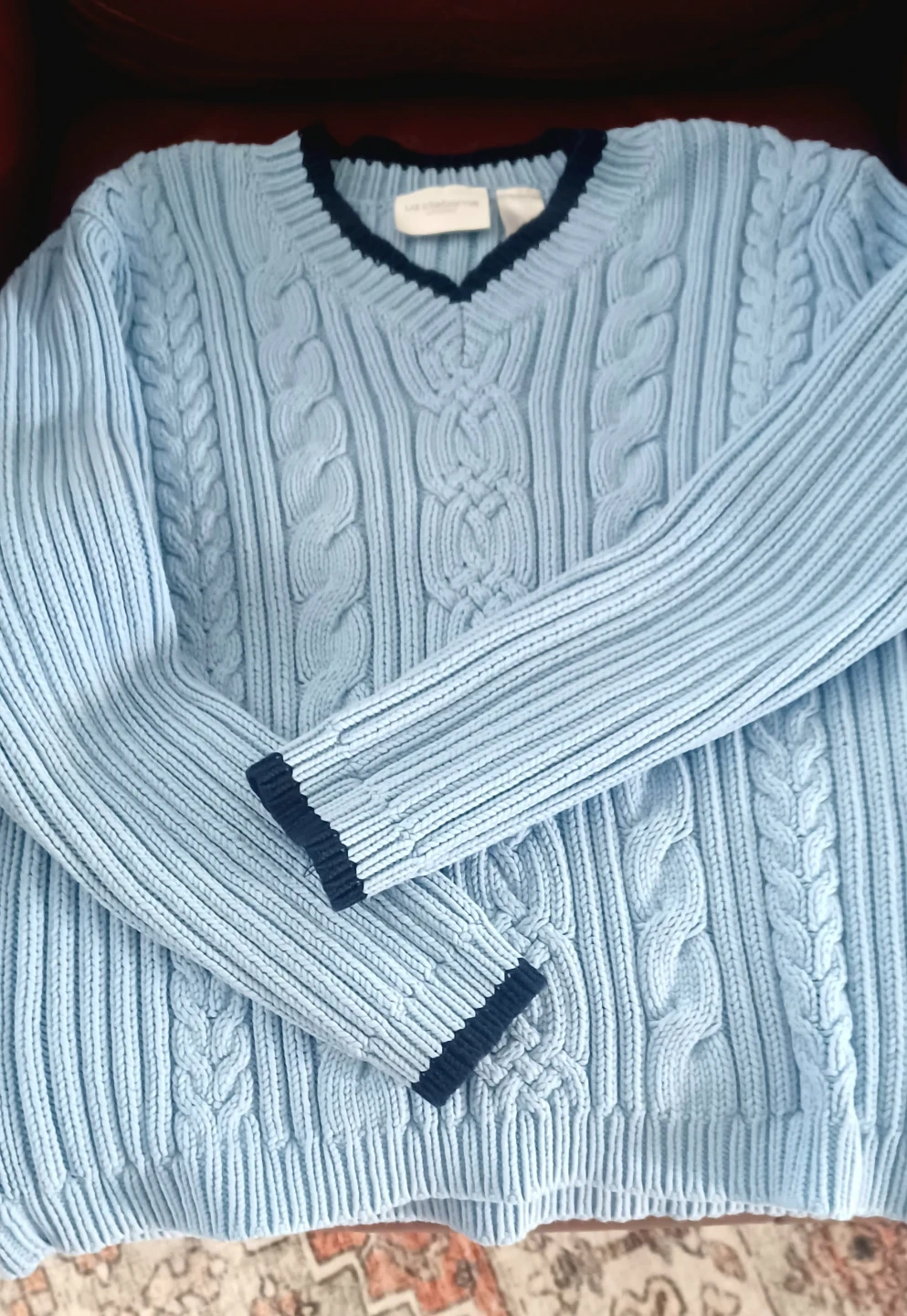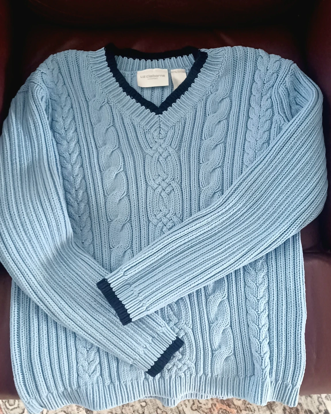Cozy light blue warm sweater from Liz Claiborne! It features a classic V-neck design with navy blue trim. Perfect for layering or wearing on its own.