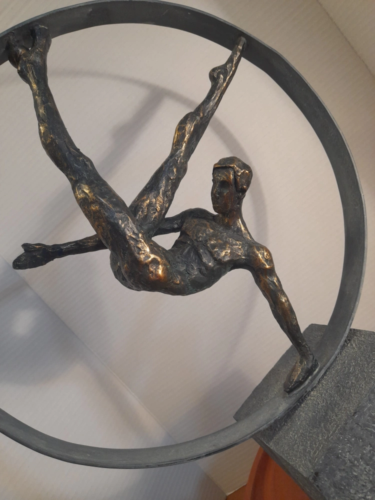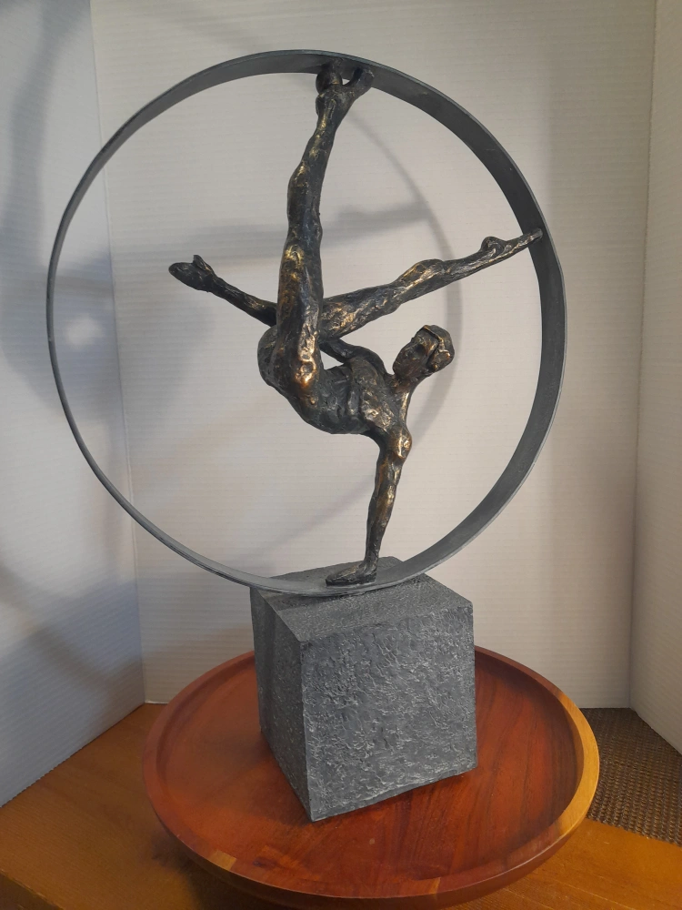 Unique sculpture featuring a gymnast in a dynamic pose within a circle, mounted on a square base. The piece has a bronze finish, giving it a classic and artistic look. It would be a great addition to any art collection or as a standalone decorative item for your home or office