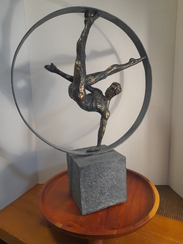 Unique sculpture featuring a gymnast in a dynamic pose within a circle, mounted on a square base. The piece has a bronze finish, giving it a classic and artistic look. It would be a great addition to any art collection or as a standalone decorative item for your home or office