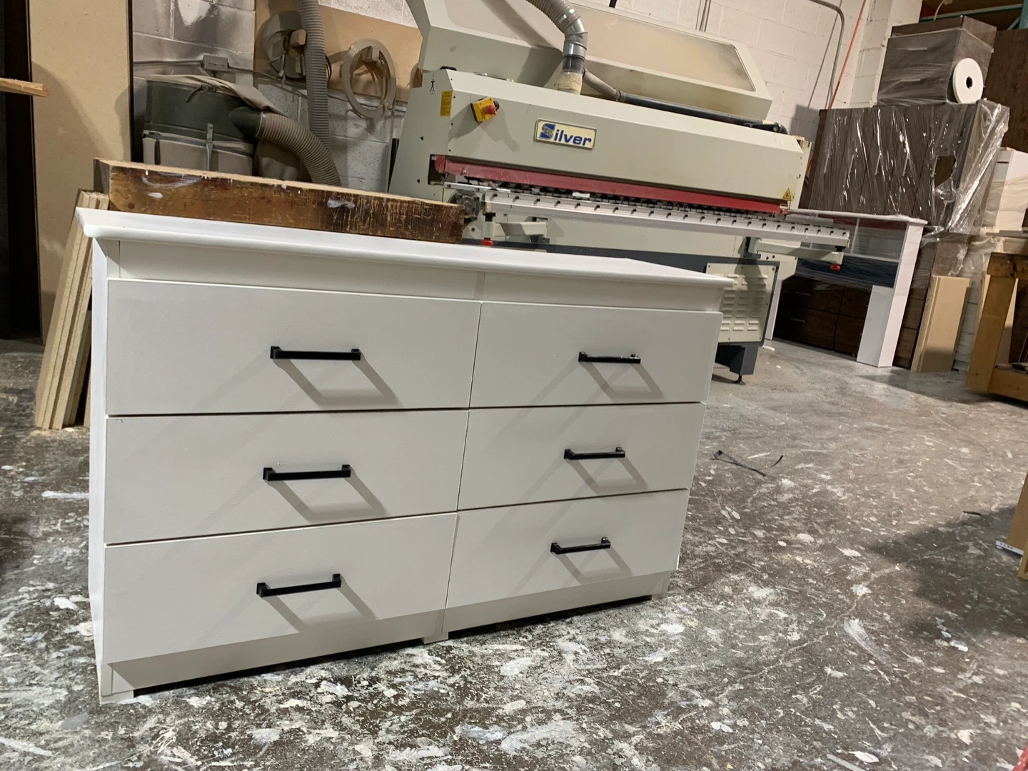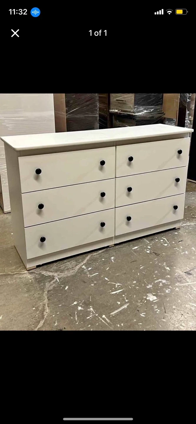 White dresser with six drawers. It has gold-coloured drawer pulls. This dresser offers ample storage space for clothing and linens.