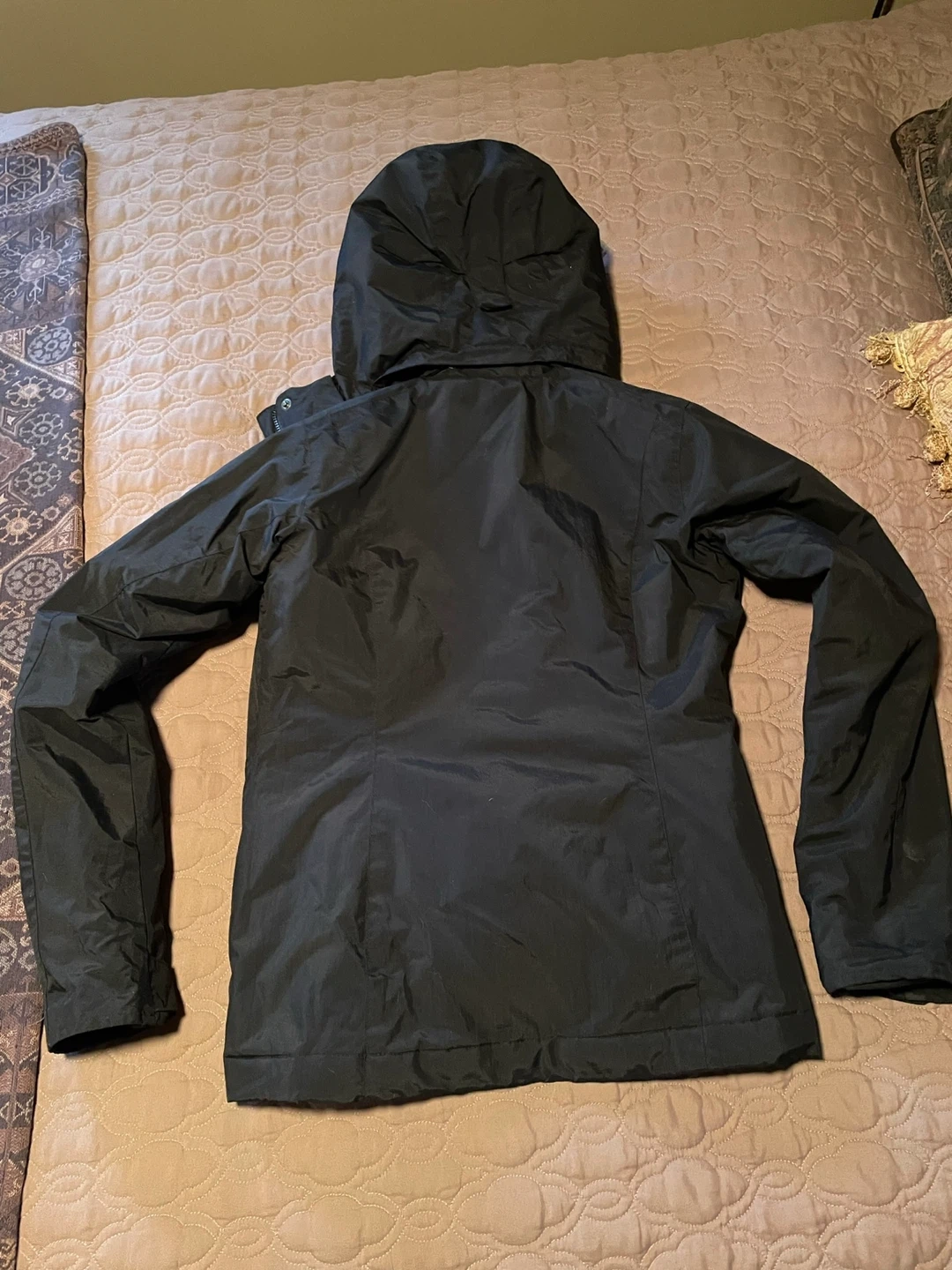 Here's a Columbia women's winter jacket in size small. It's a great jacket for staying warm and dry during the colder months. The jacket is black and features Columbia's Omni-Shield technology for water resistance.