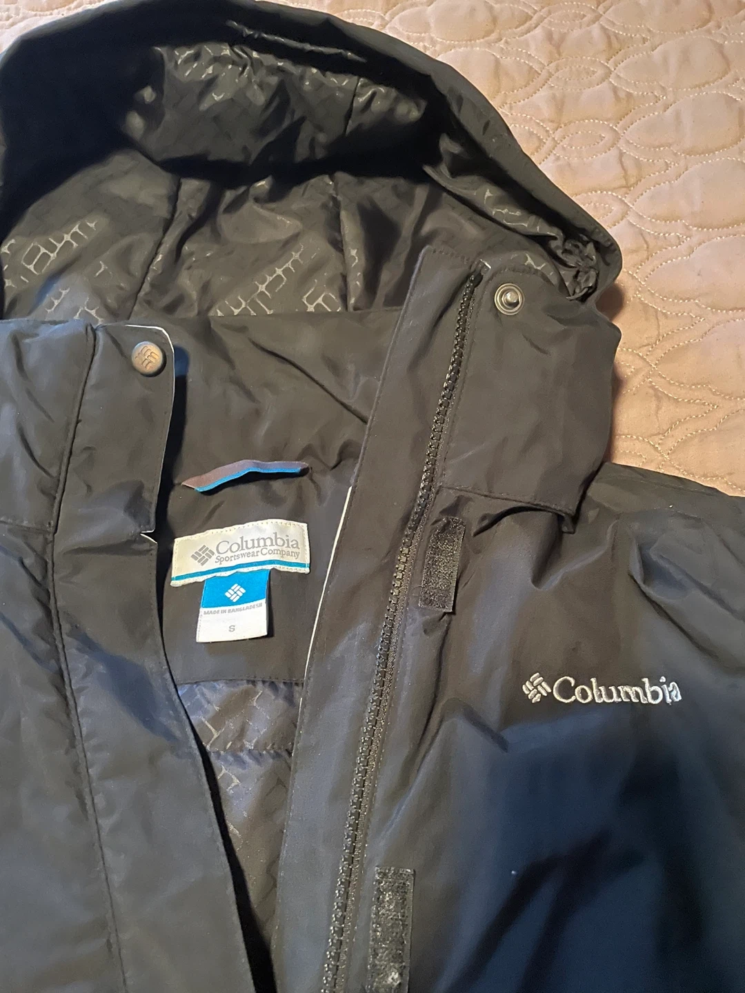 Here's a Columbia women's winter jacket in size small. It's a great jacket for staying warm and dry during the colder months. The jacket is black and features Columbia's Omni-Shield technology for water resistance.