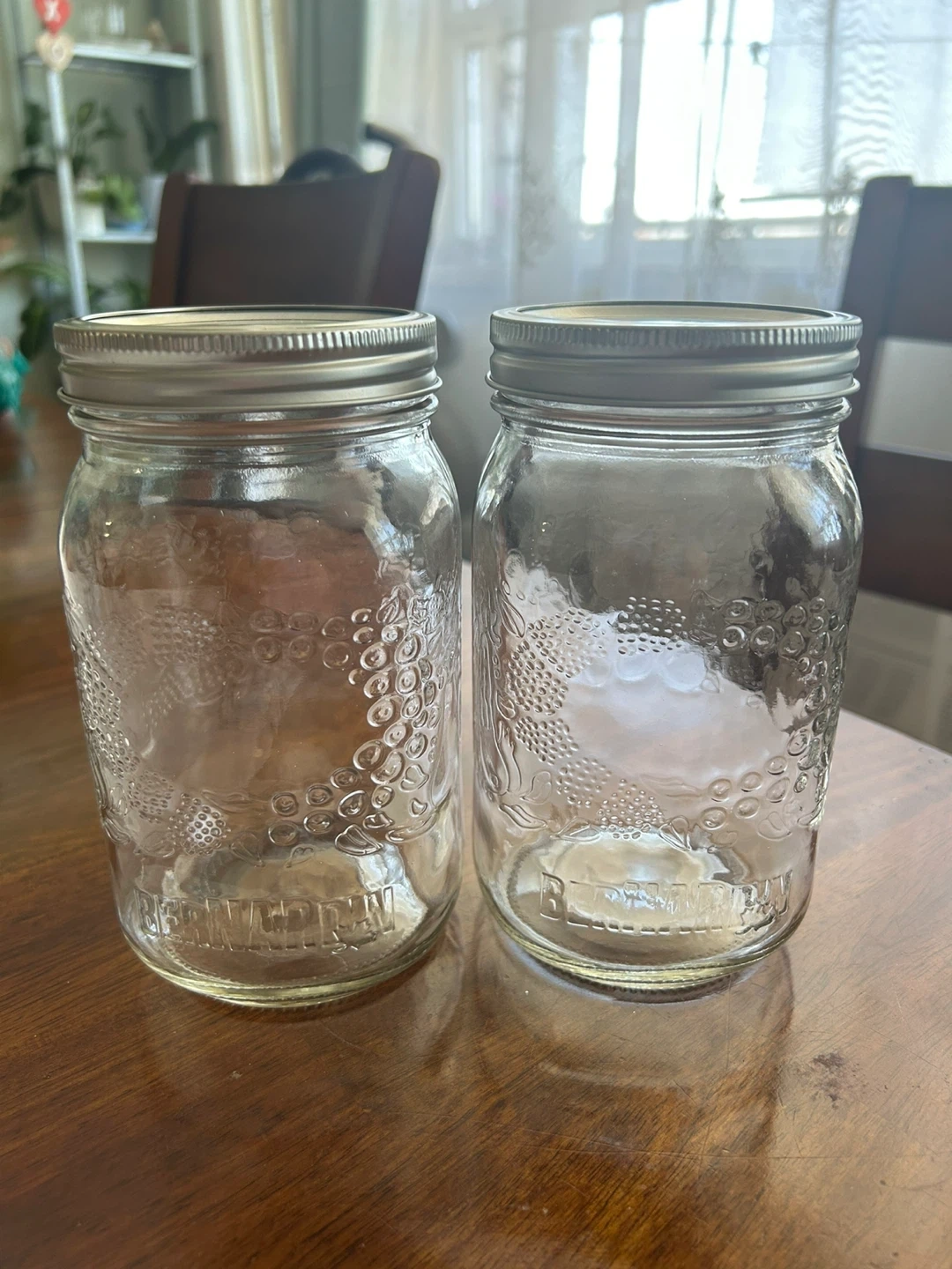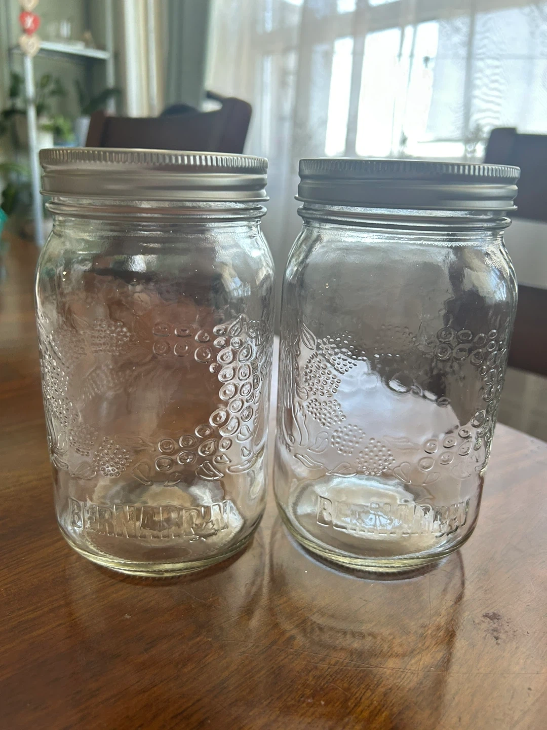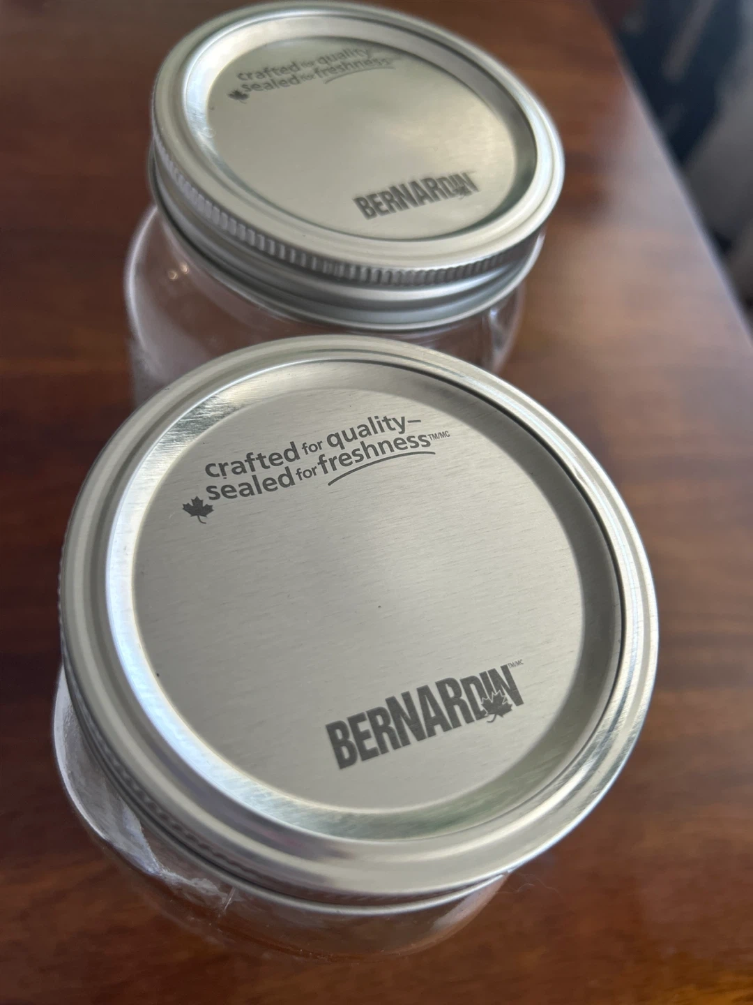 Selling a set of two Bernardin mason jars. They're new and ready for canning, storage, or crafting! The lids are marked 'Crafted for quality, Sealed for freshness'.