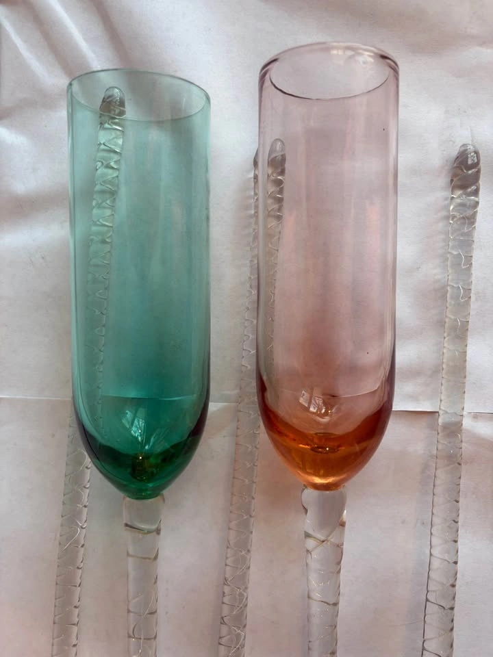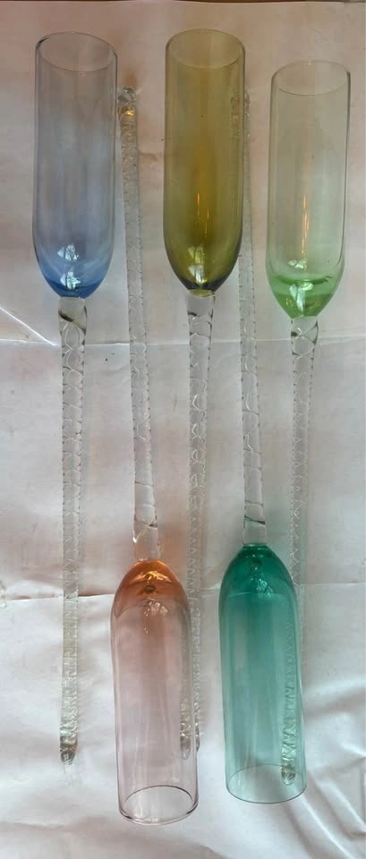 Set of 5 hand-blown, long-stemmed, colored champagne flutes with a glass holder. The flutes are 17 inches tall. One flute has a small, half-inch scratch in the middle. The holder also has some scratches around the middle, likely from normal use. These are hard to see in the photos (pics 7 & 8). I can send more pictures if needed.