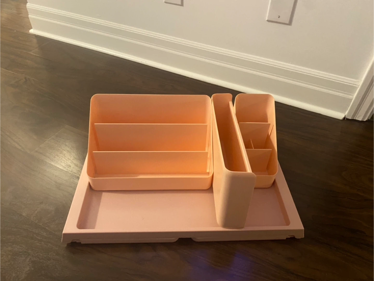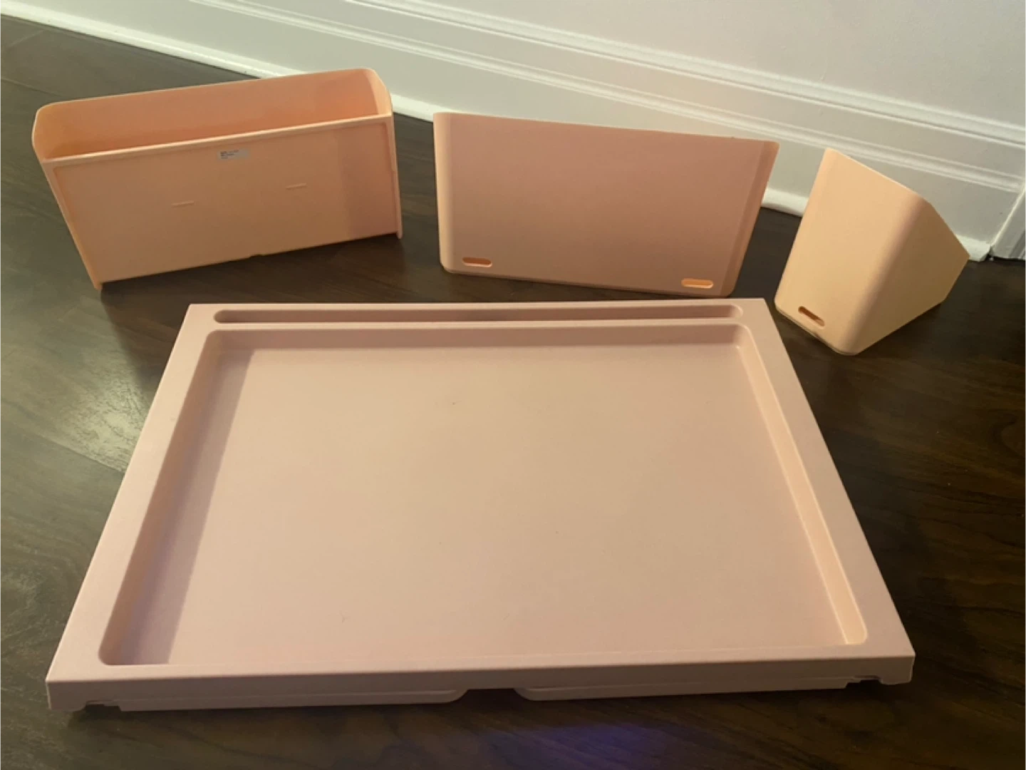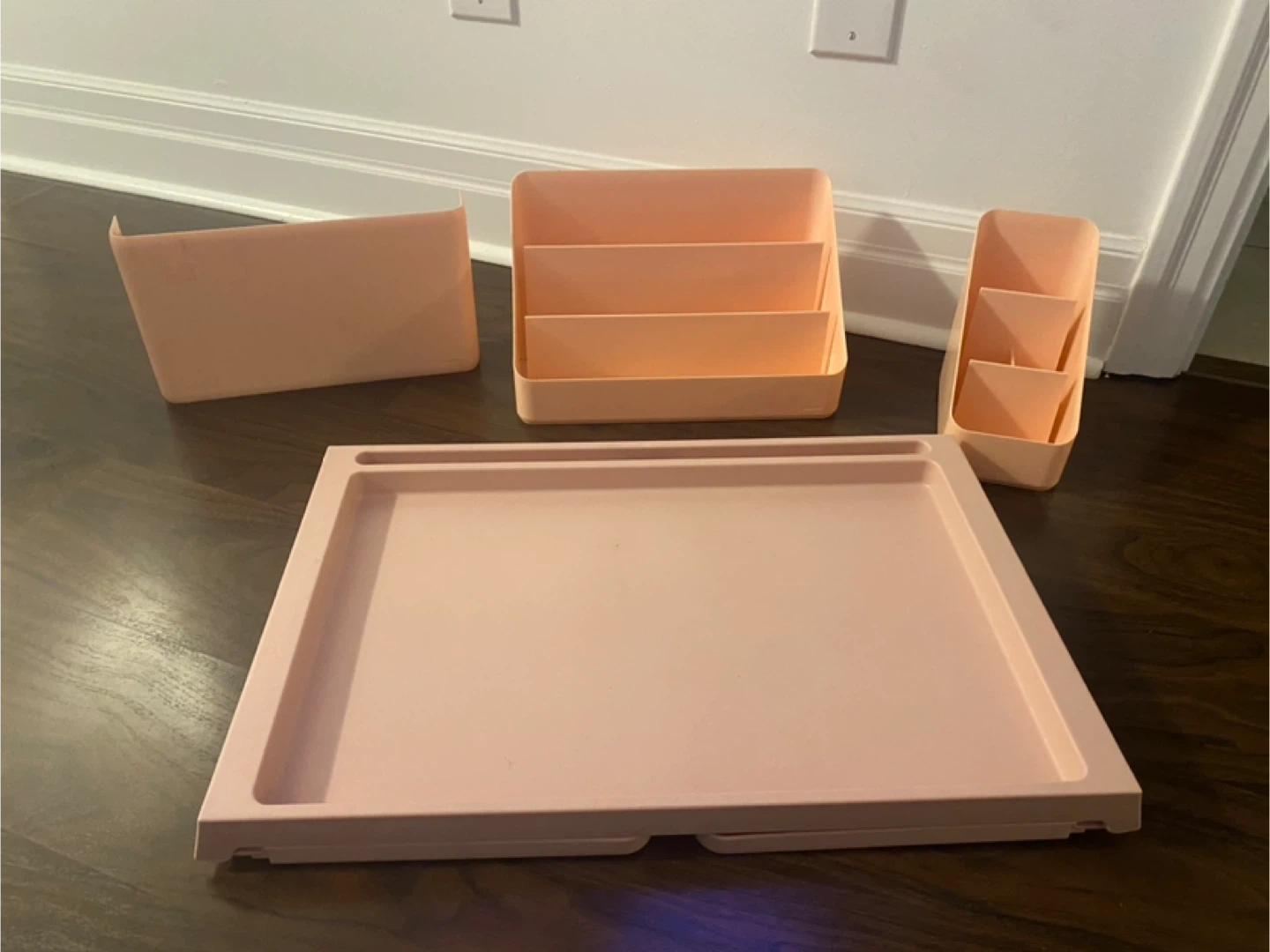 Selling a cute pink desk organizer set! It's perfect for keeping your workspace tidy and stylish. Includes a tray, letter organizer, and pen holder. Great for students or anyone working from home