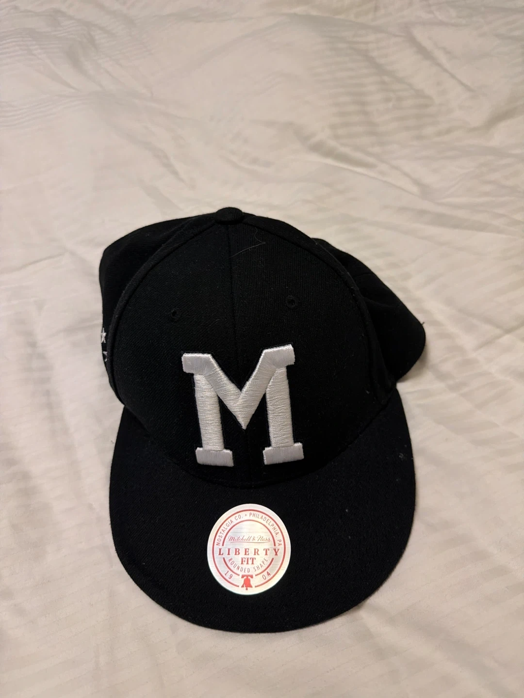 This is a Mitchell & Ness black baseball cap with a prominent white 'M' on the front. It's a Liberty Fit model with a rounded shape. This cap is great for showing team spirit or for casual wear.