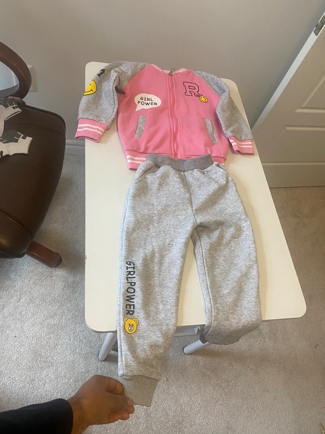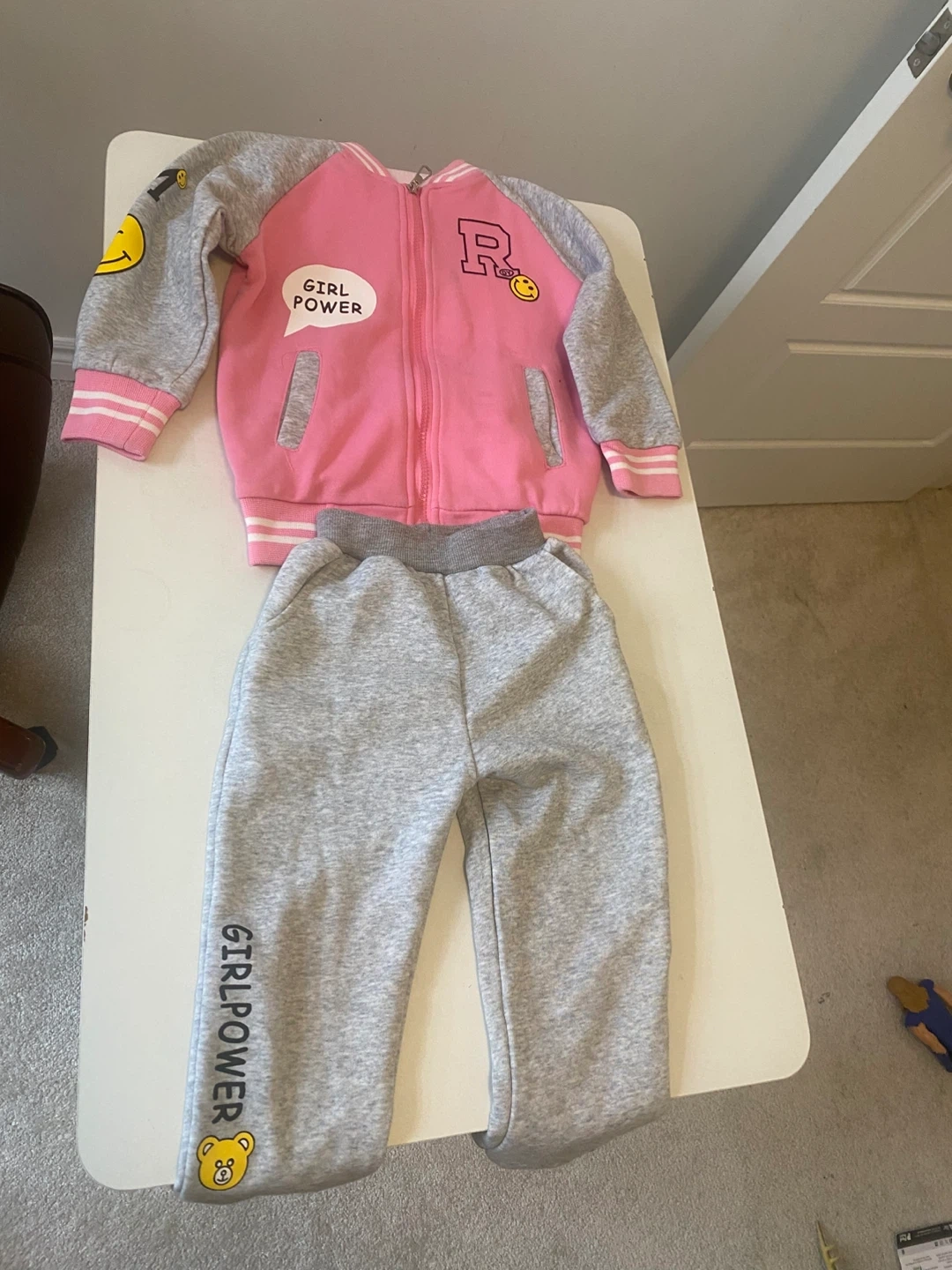 A cute pink and grey tracksuit set for girls! The jacket is pink with grey sleeves and a fun design, while the pants are grey with 'GIRL POWER' printed on the leg. Perfect for keeping your little one comfy and stylish. For 2-4 years old.