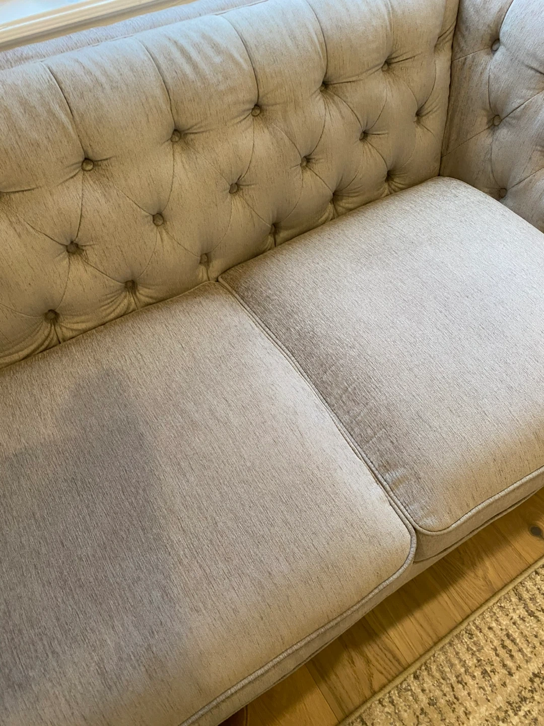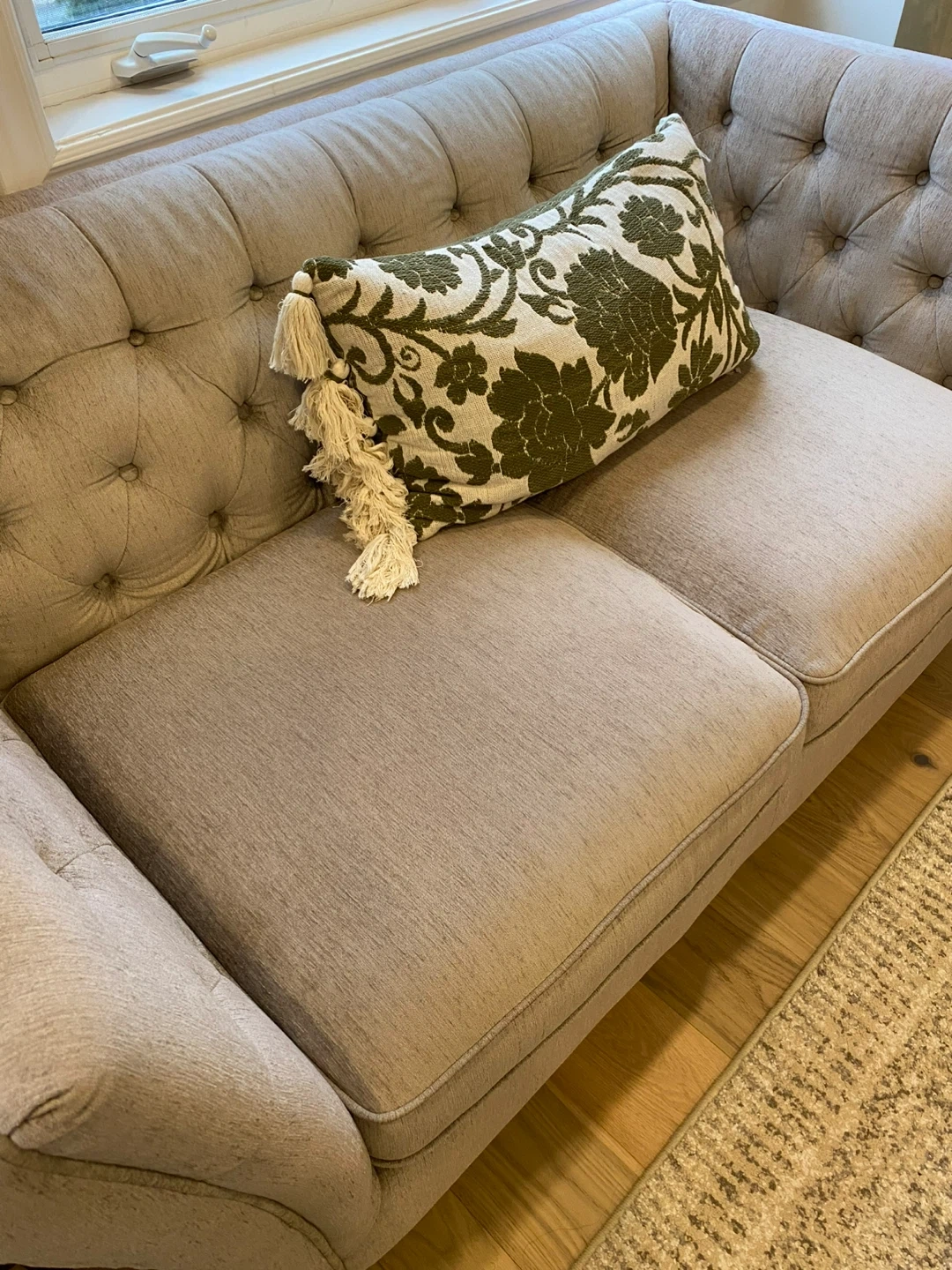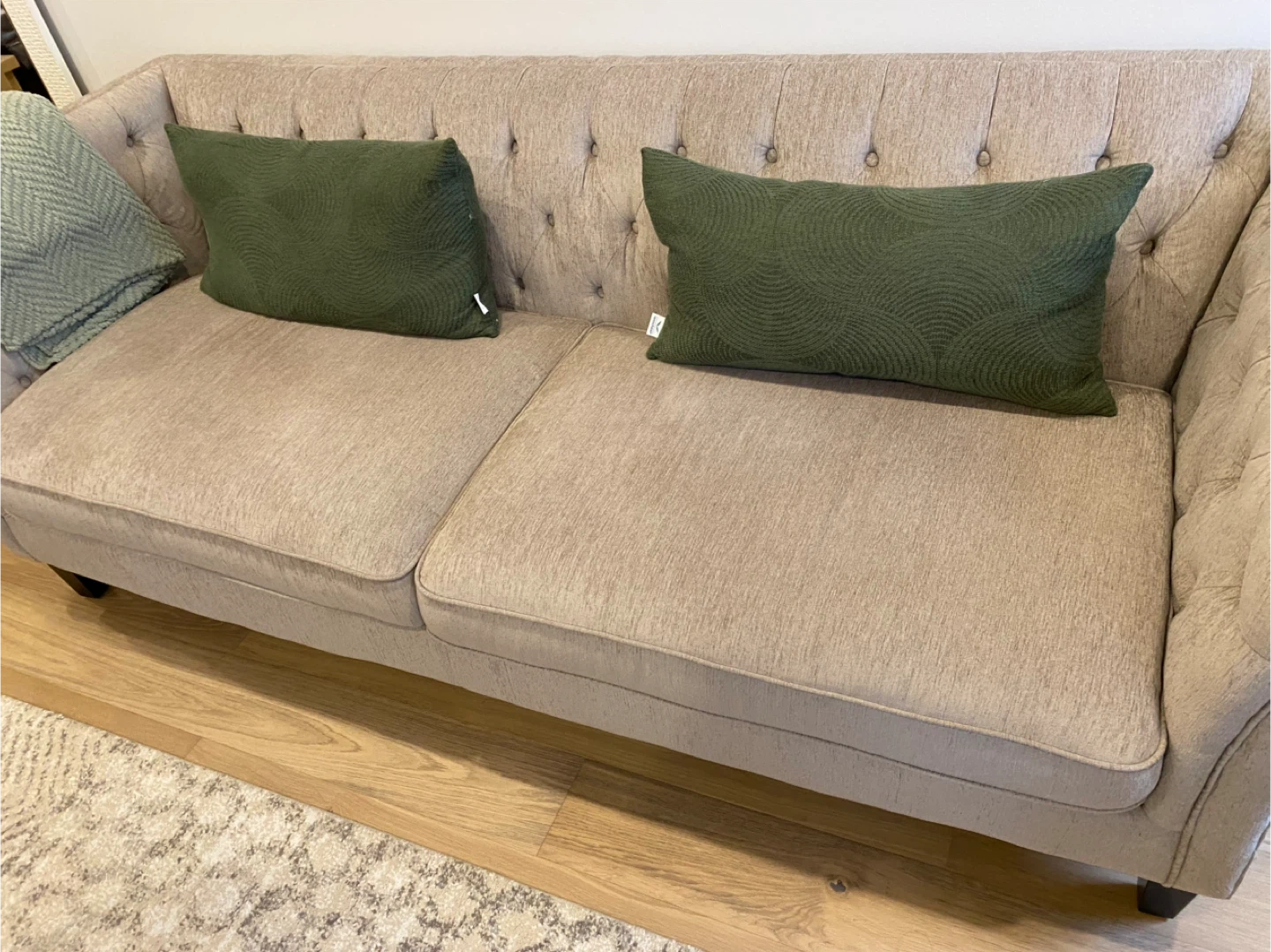 Selling a tufted sofa in a neutral colour. It's in good condition and would be a great addition to any living room. The sofa features classic tufted detailing and comfortable cushions.