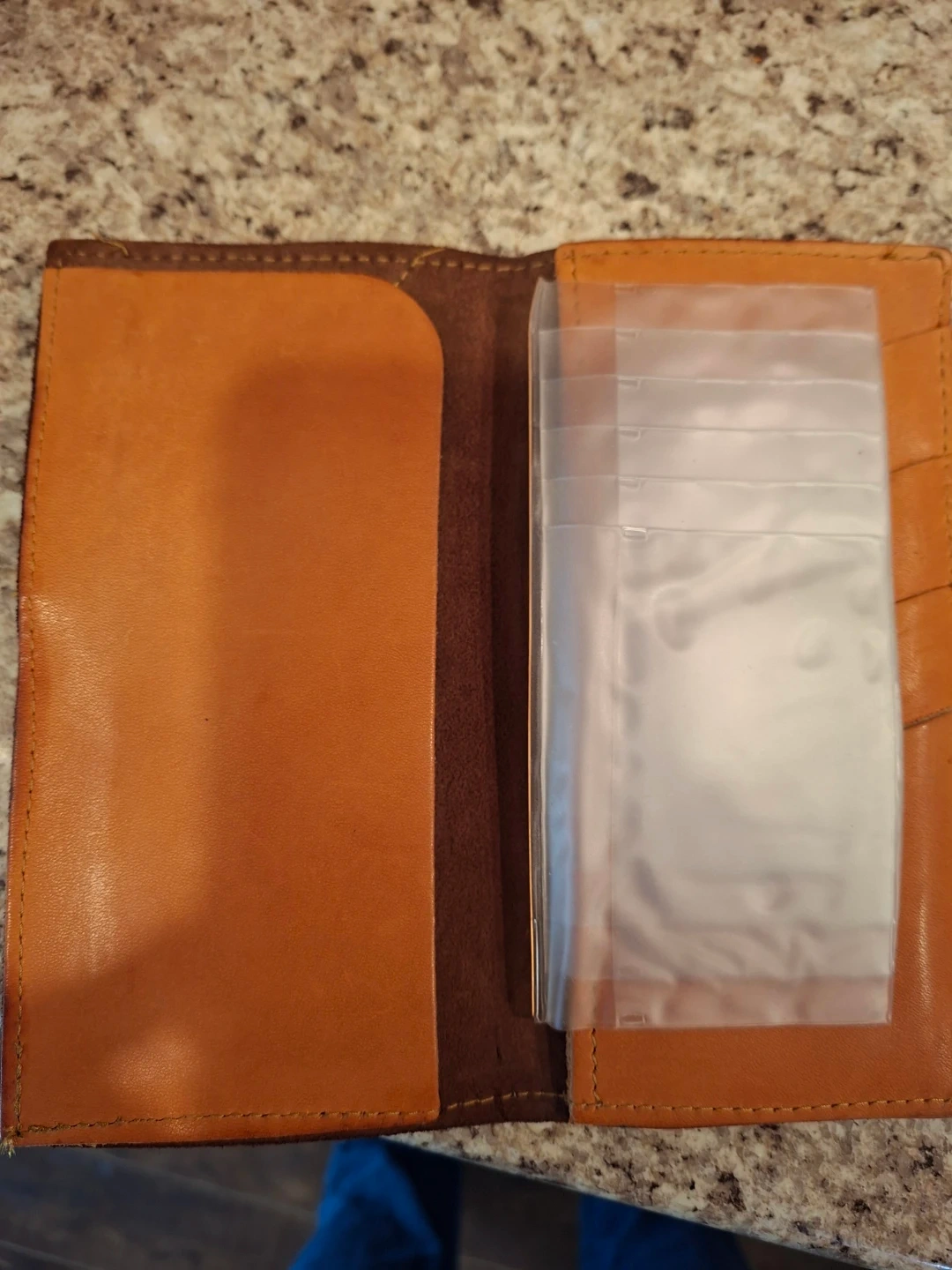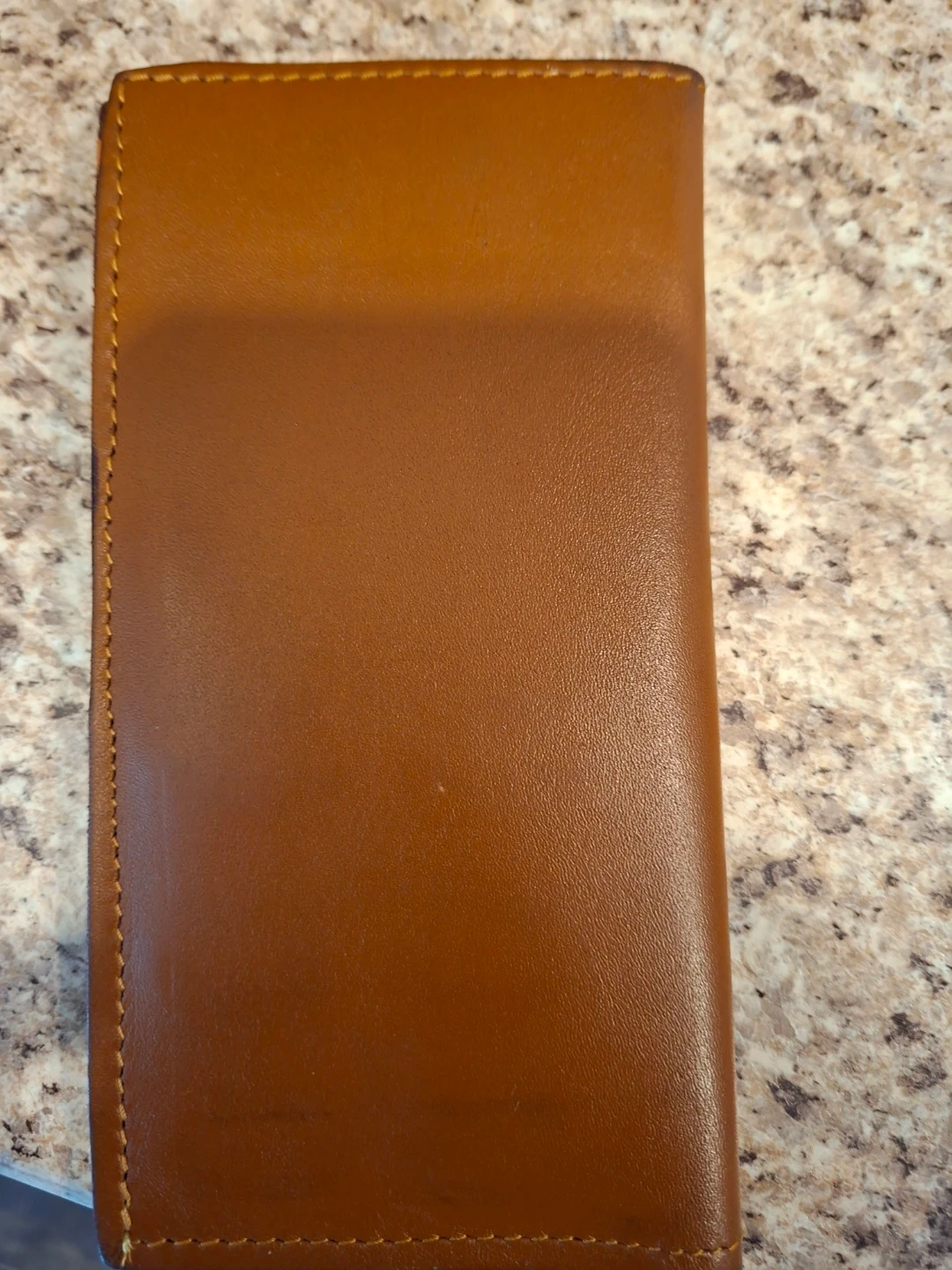 Brown leather bifold wallet with a decorative concho accent. It's got multiple card slots and a clear ID window. Perfect for keeping your essentials organized!