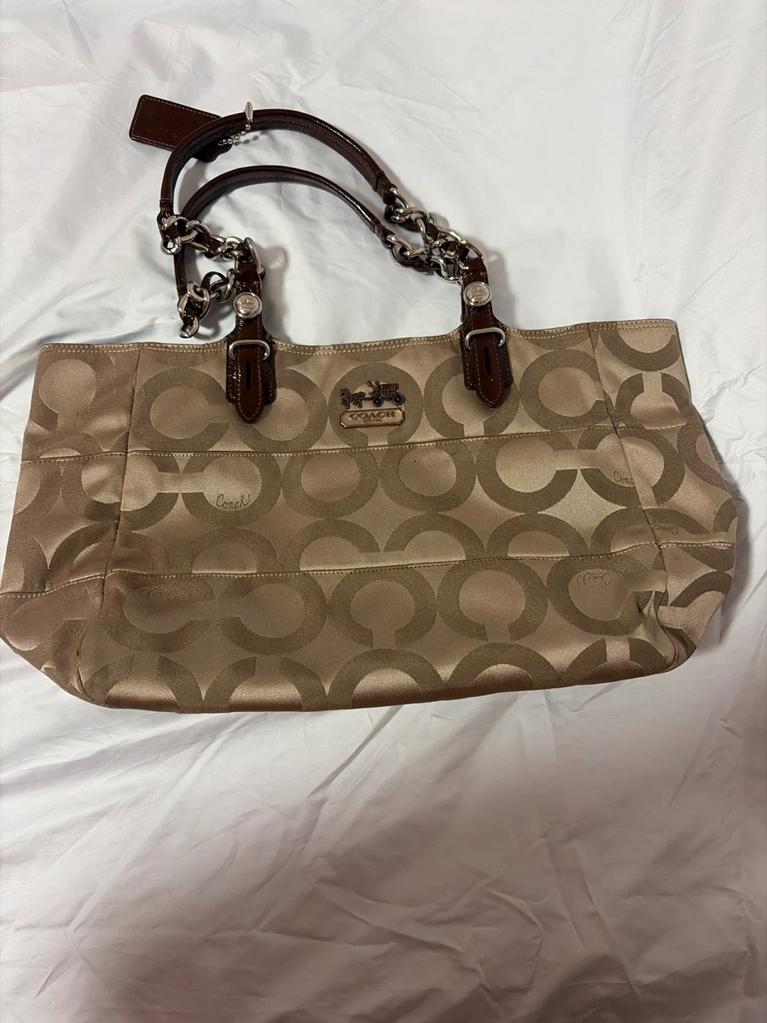 Stylish Coach tote bag with signature C monogram pattern. Features patent leather trim and silver chain accents. The interior is lined in pink satin and includes interior pockets.
