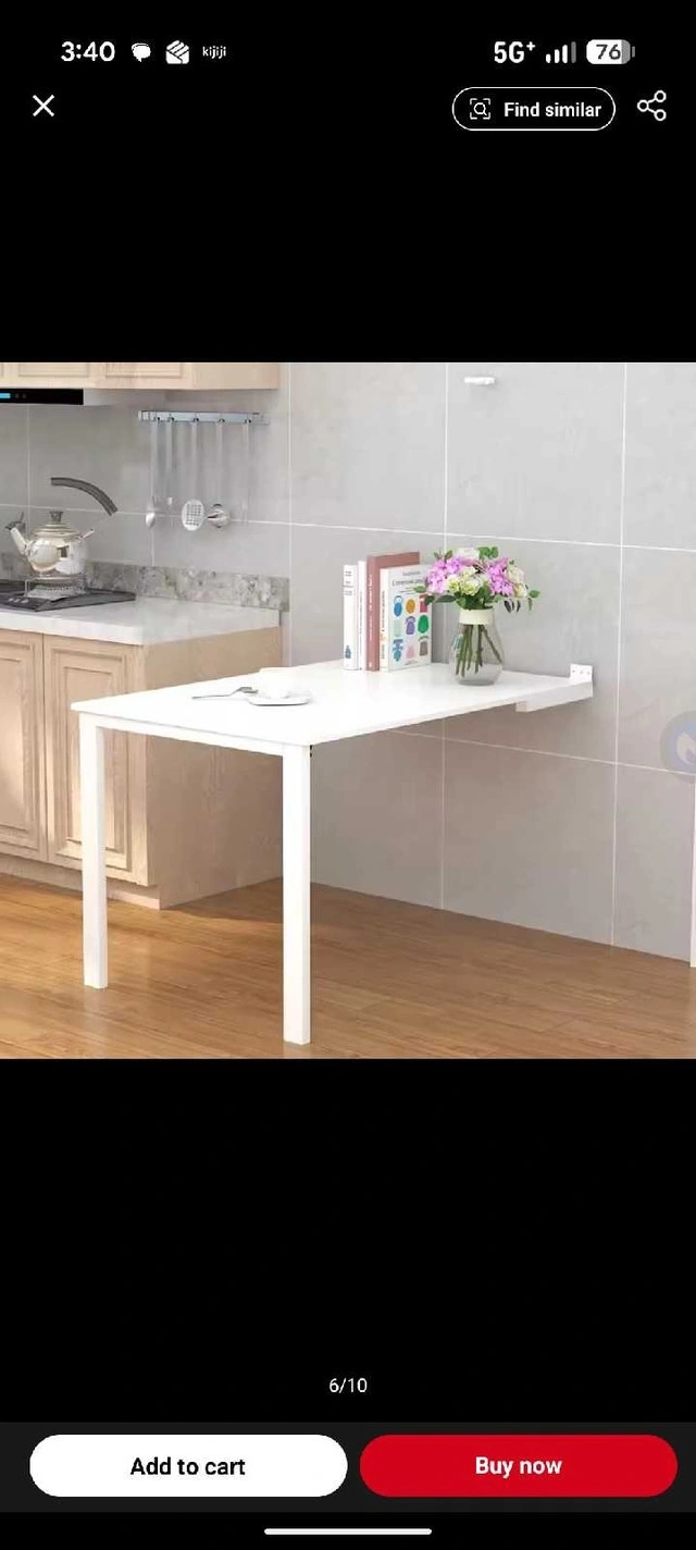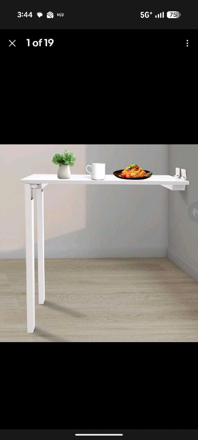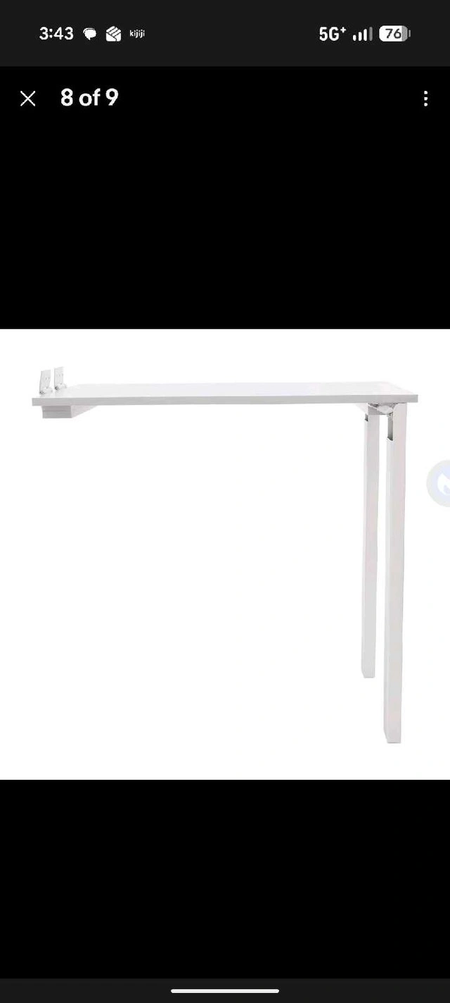 Two fold-up wall tables available, both white. They fold against the wall and double as art frames. One is 31.5" x 47" for $250, and the other is 23.5" x 47" (has a few scuffs) for $150.