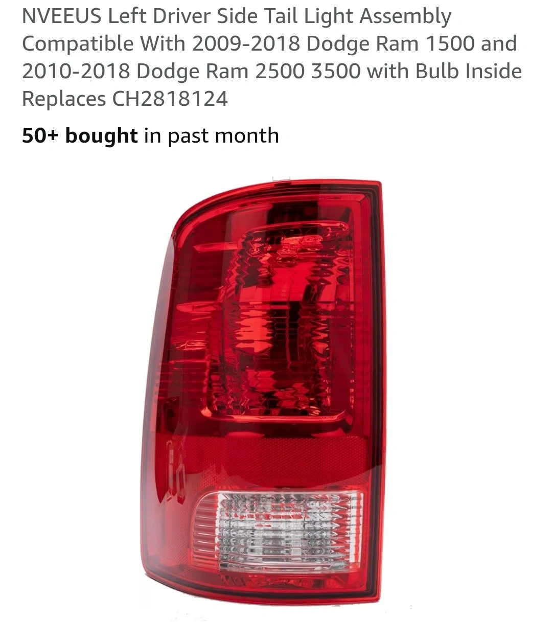 This is the NVEEUS left driver side tail light assembly. It's compatible with 2009-2018 Dodge Ram 1500 and 2010-2018 Dodge Ram 2500 3500 models. A bulb is included inside.