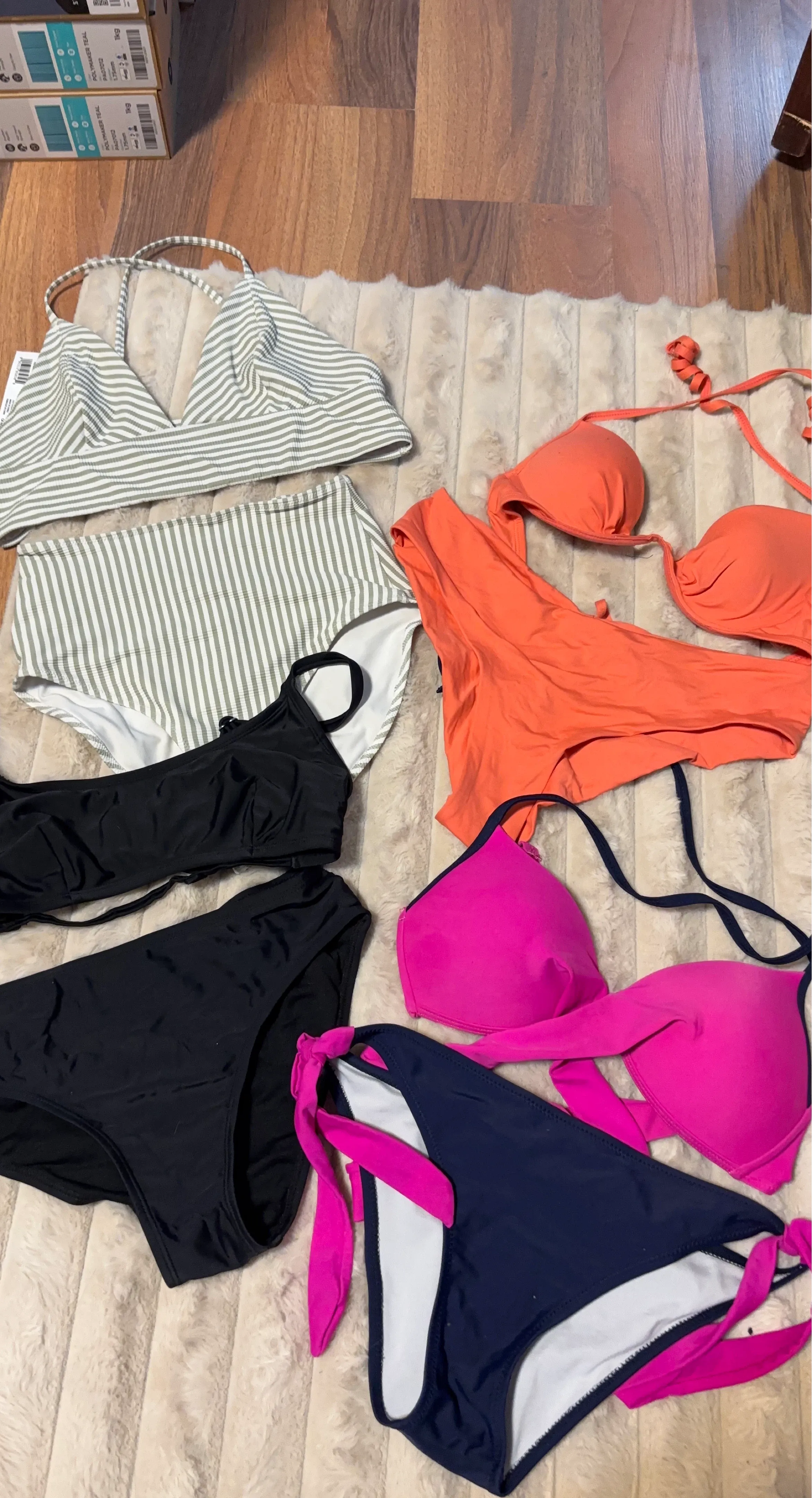 This bundle includes a variety of bikini tops and bottoms in different colours and styles. It has a green and white striped bikini set, a bright orange bikini set, a black bikini set, and a navy bikini set with hot pink tie details. Various sizes are included.