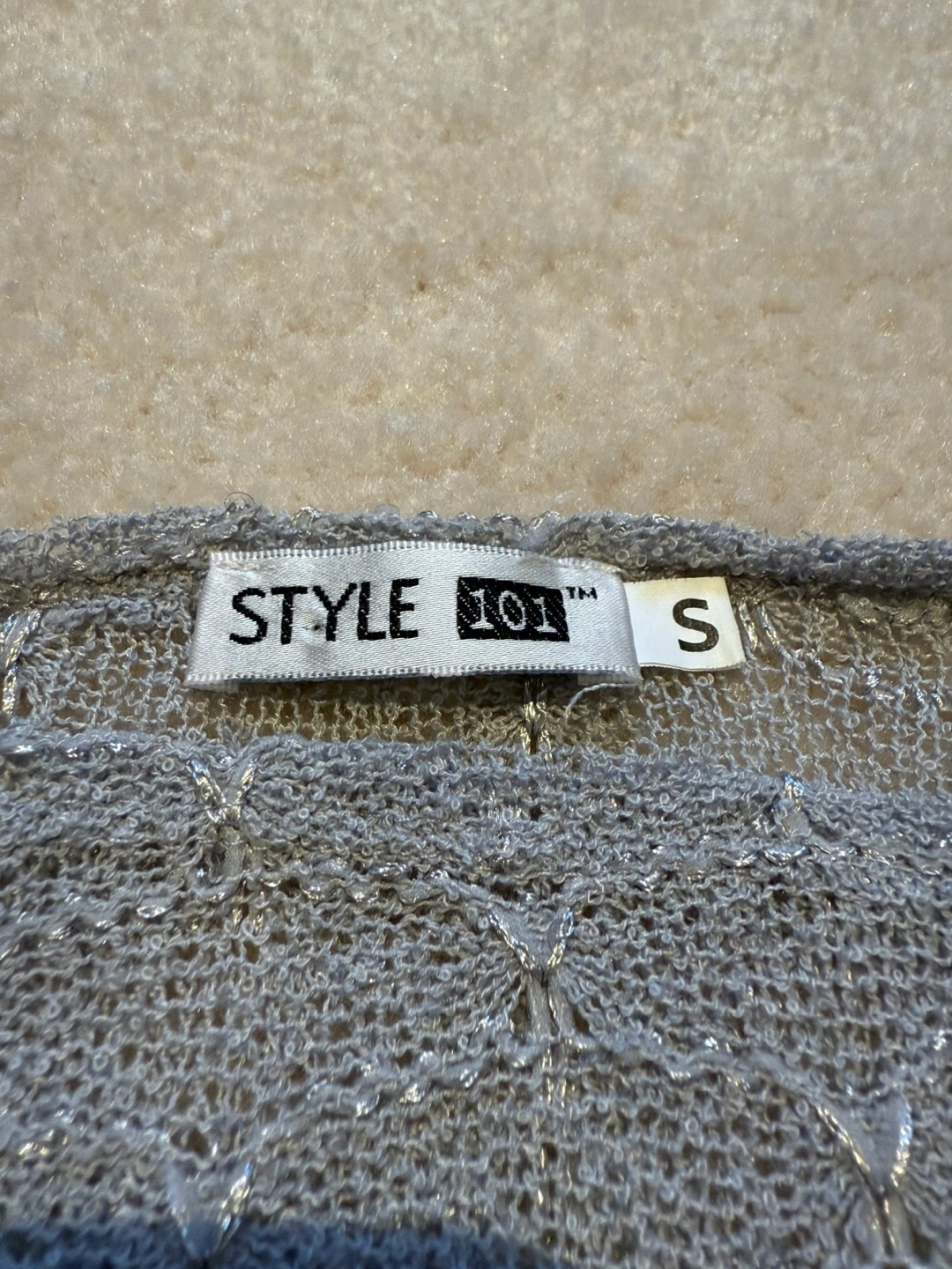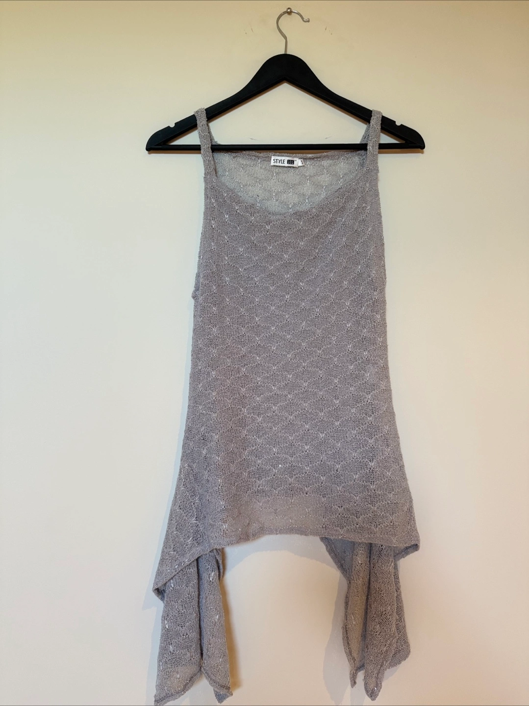 Selling a stylish flared top in size small! It's a lovely grey silver colour and in great condition. The top has an intricate mesh design. Perfect to elevate your night out!
