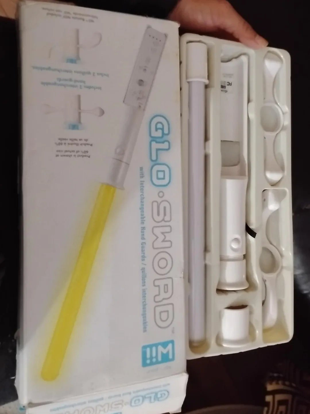 This is the GLO-SWORD accessory for the Wii, featuring interchangeable hand guards. It includes the main sword attachment and other components in its tray.