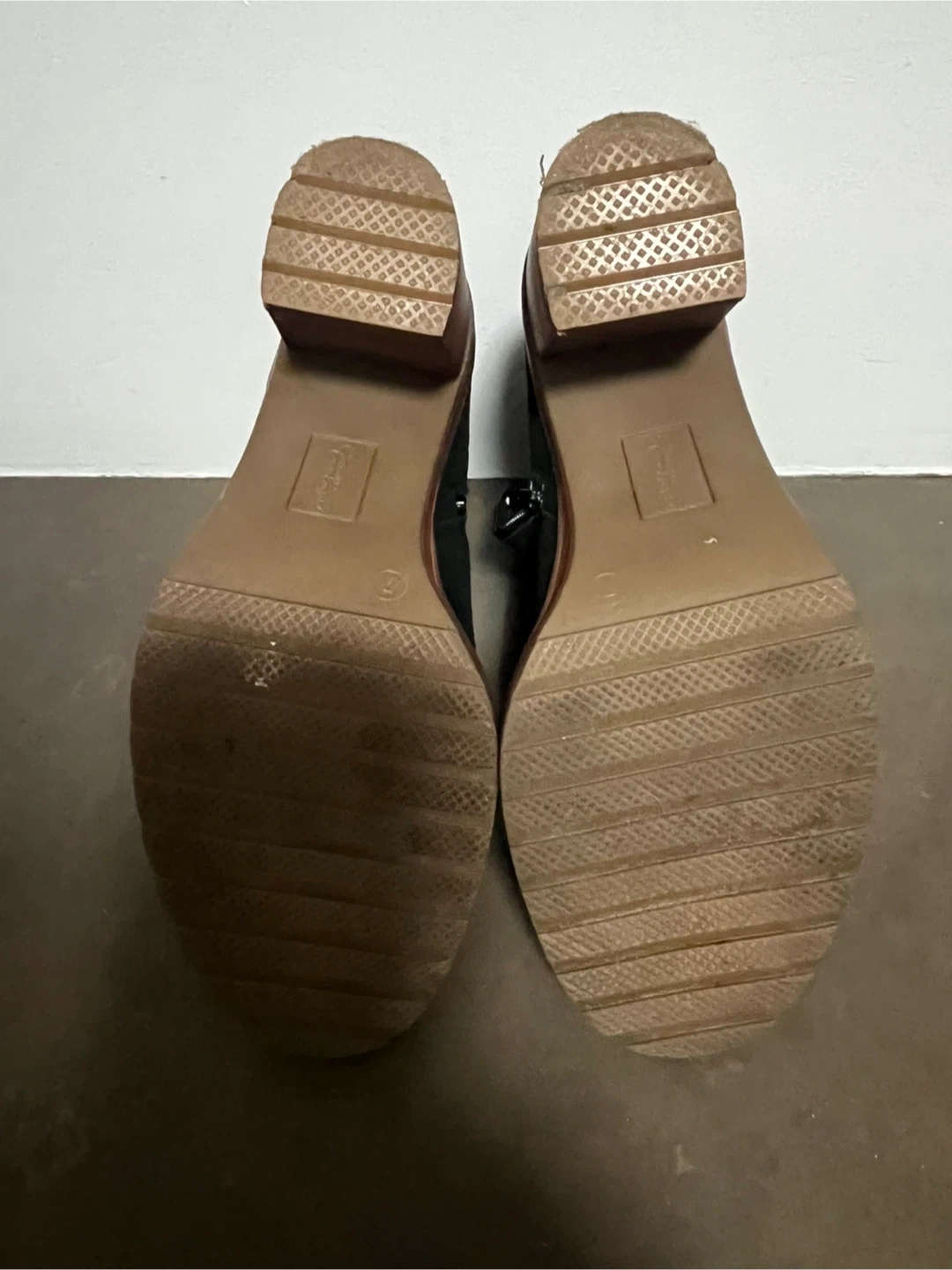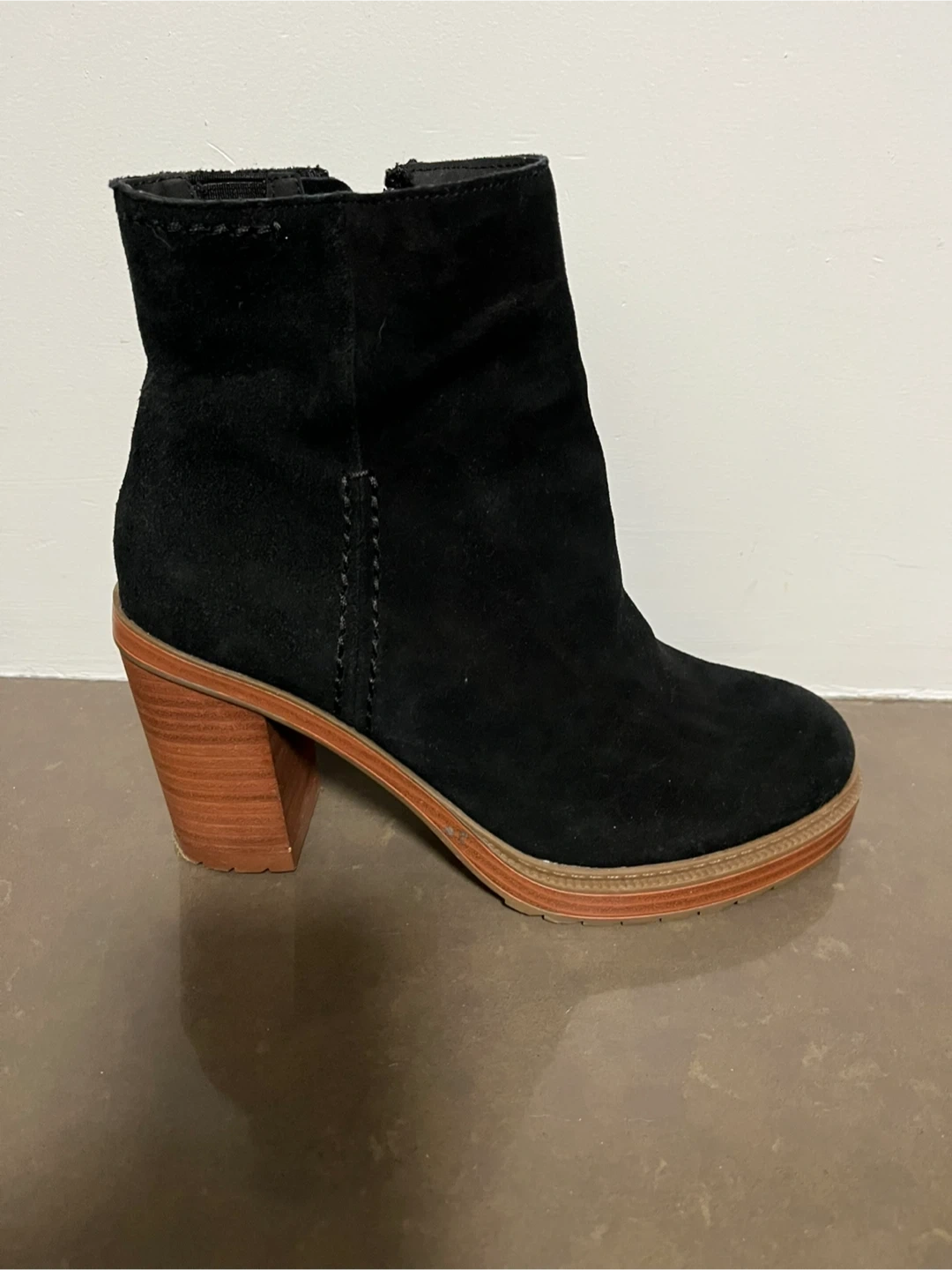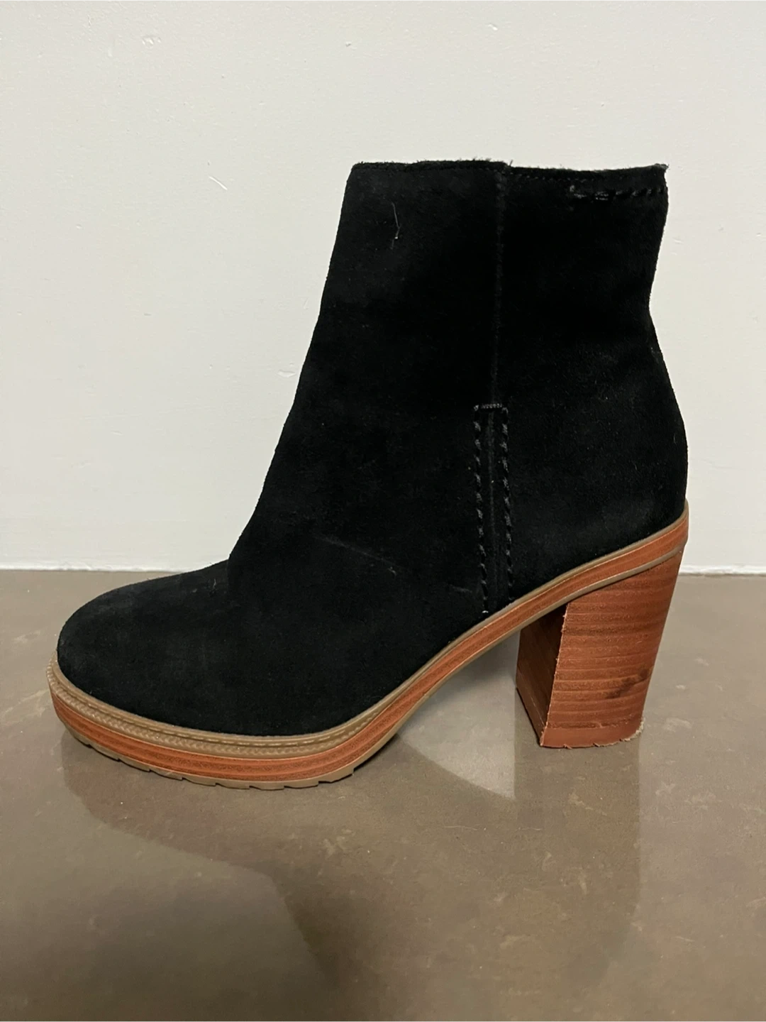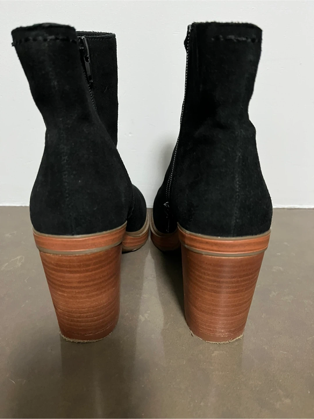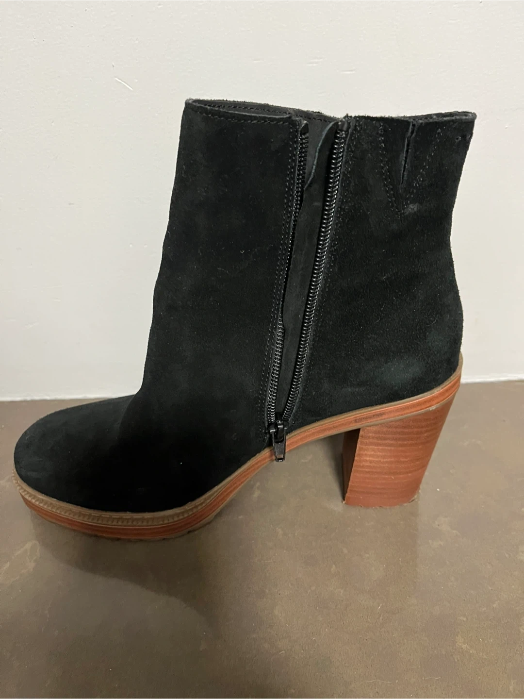 Black suede ankle boots feature a stylish block heel & a side zipper for easy wear and a comfortable fit. Size 7.