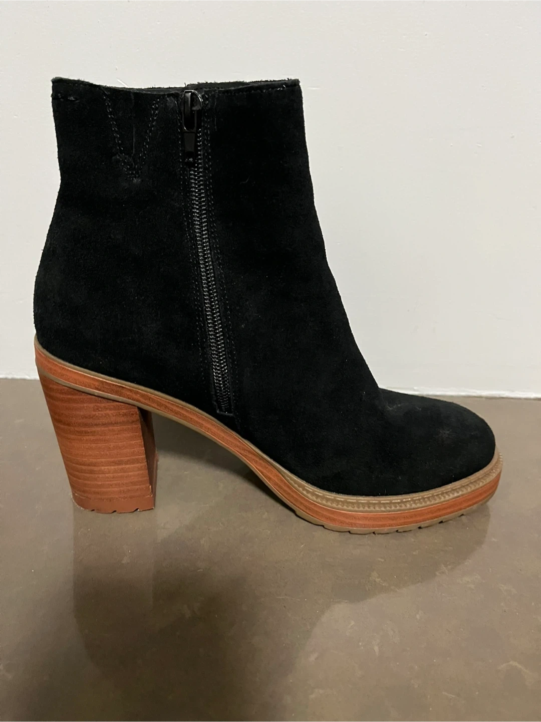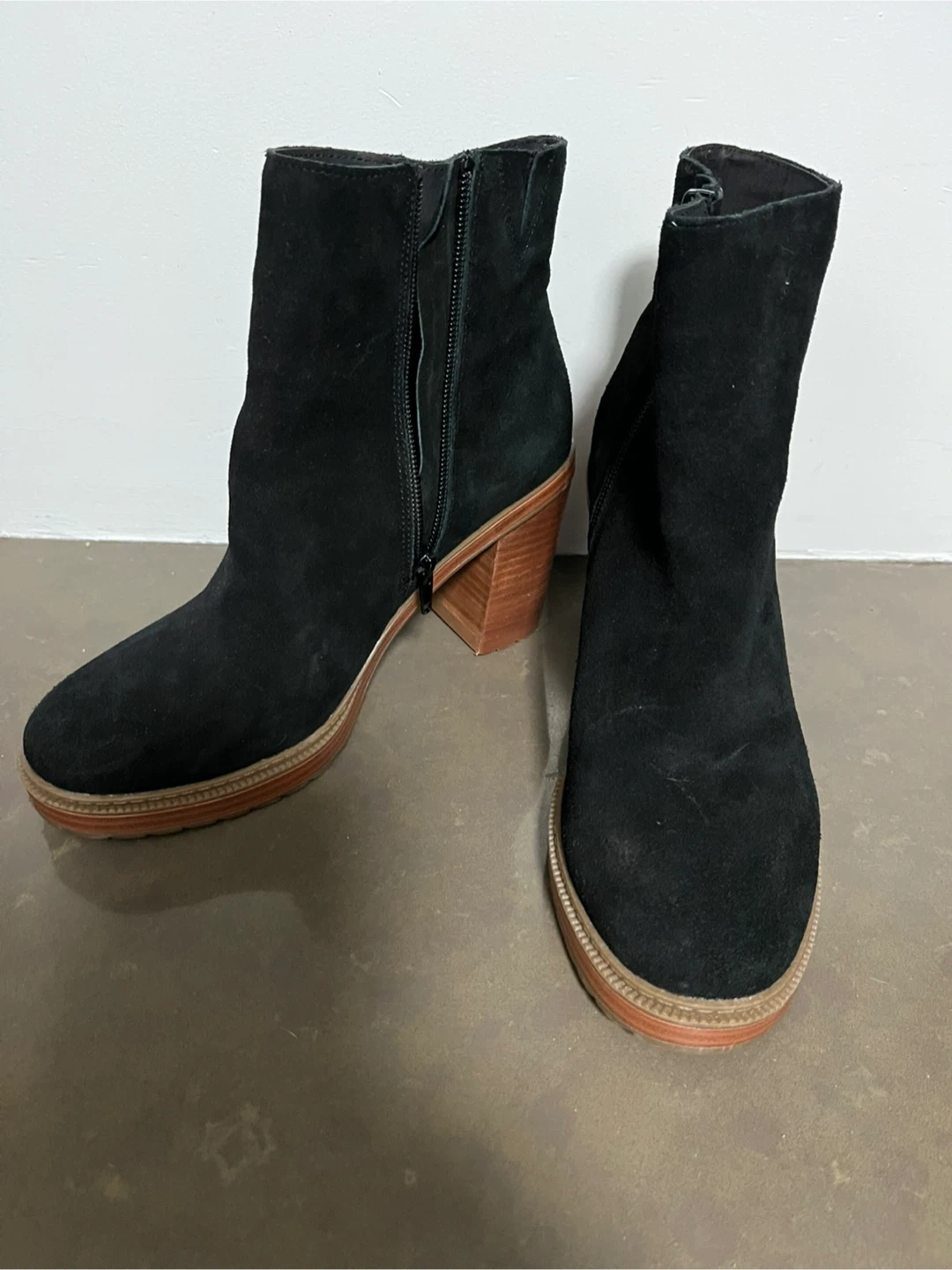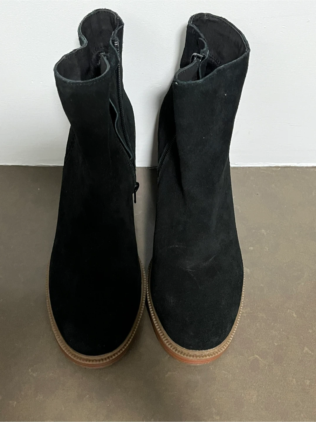 Black suede ankle boots feature a stylish block heel & a side zipper for easy wear and a comfortable fit. Size 7.