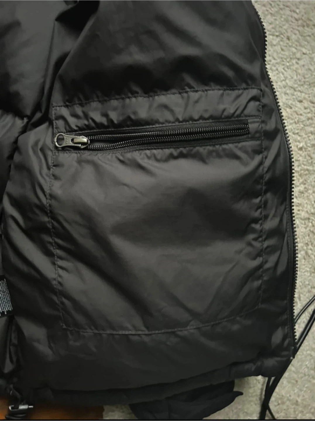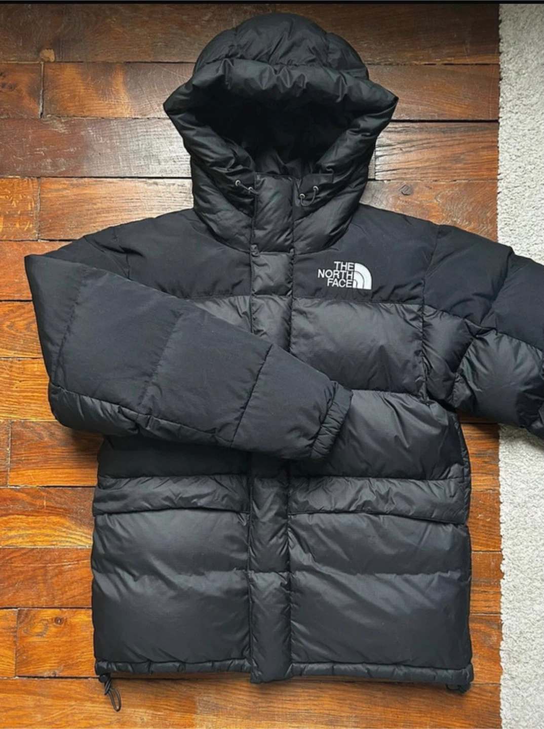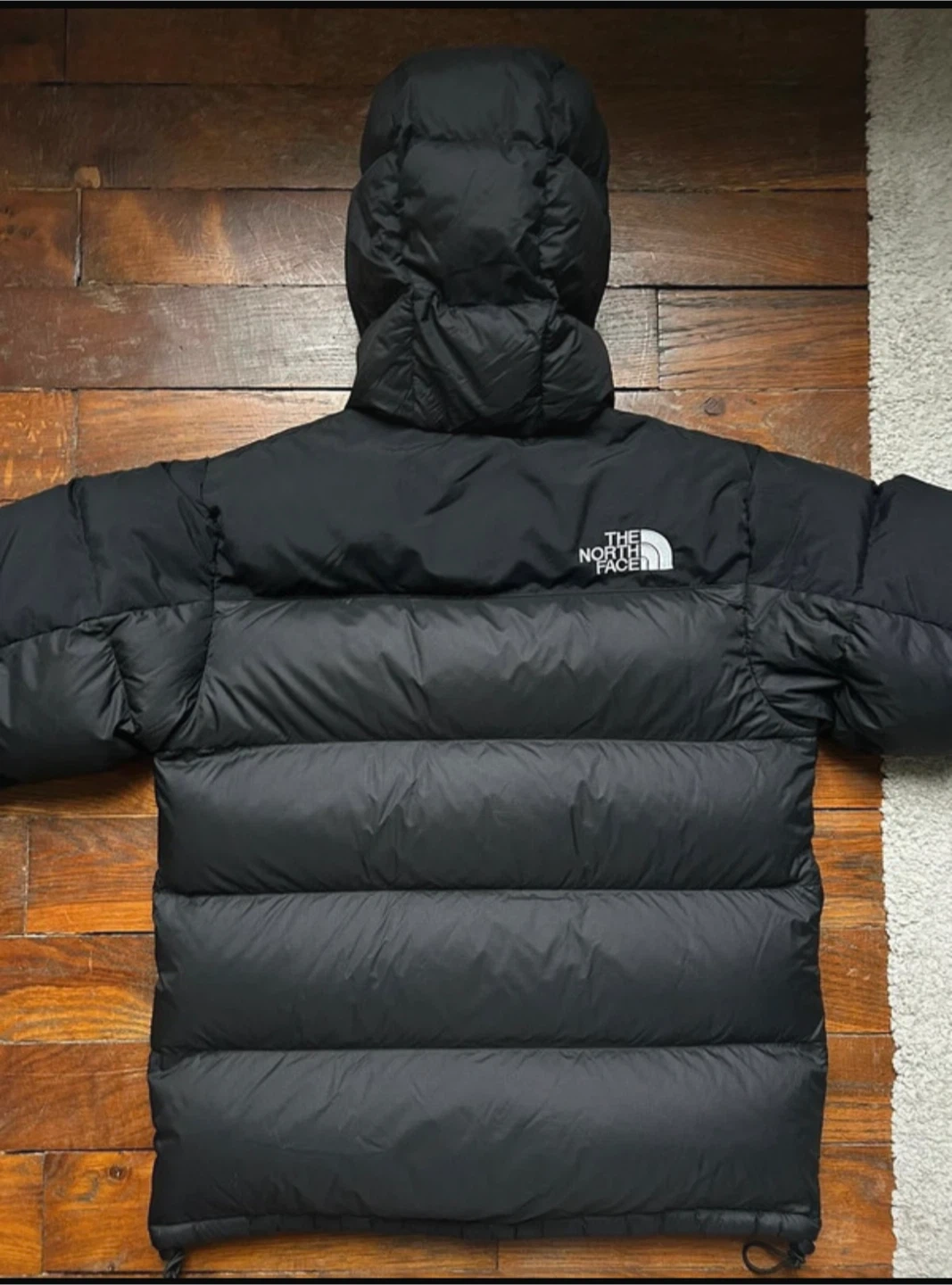 This is a black puffer jacket from The North Face. It features a full zip closure and an attached hood for extra warmth. The jacket is made with durable materials and is built to last.