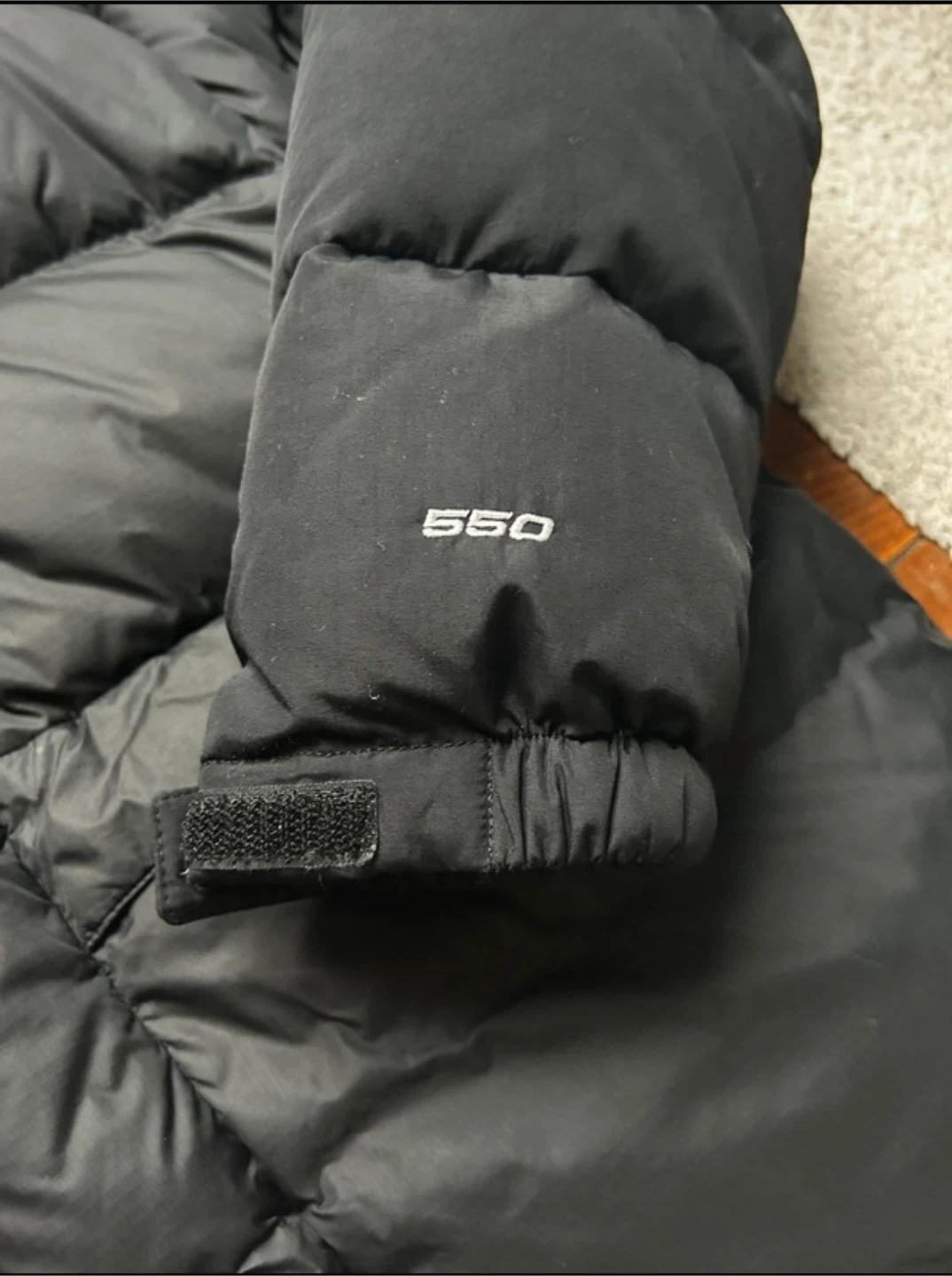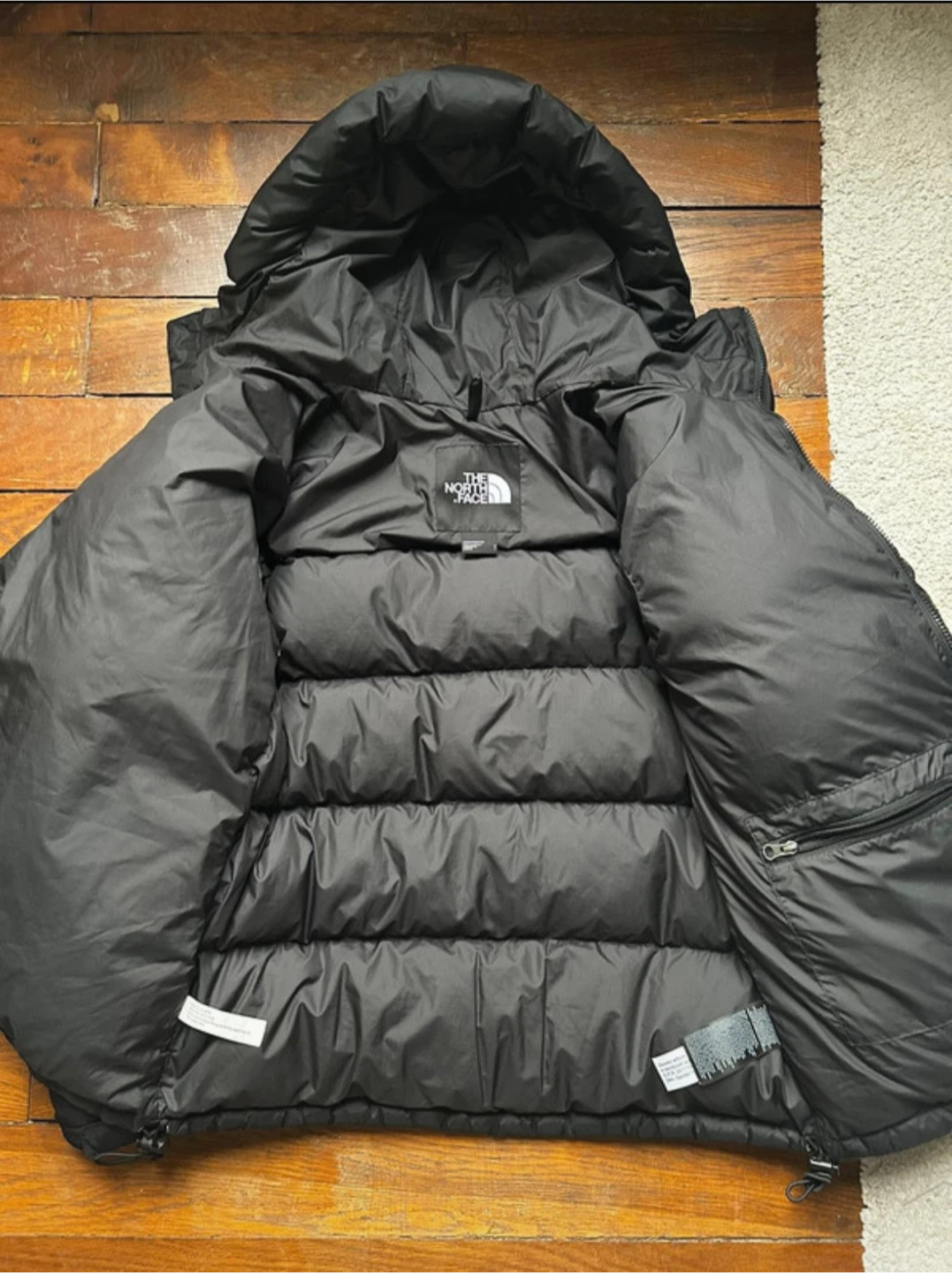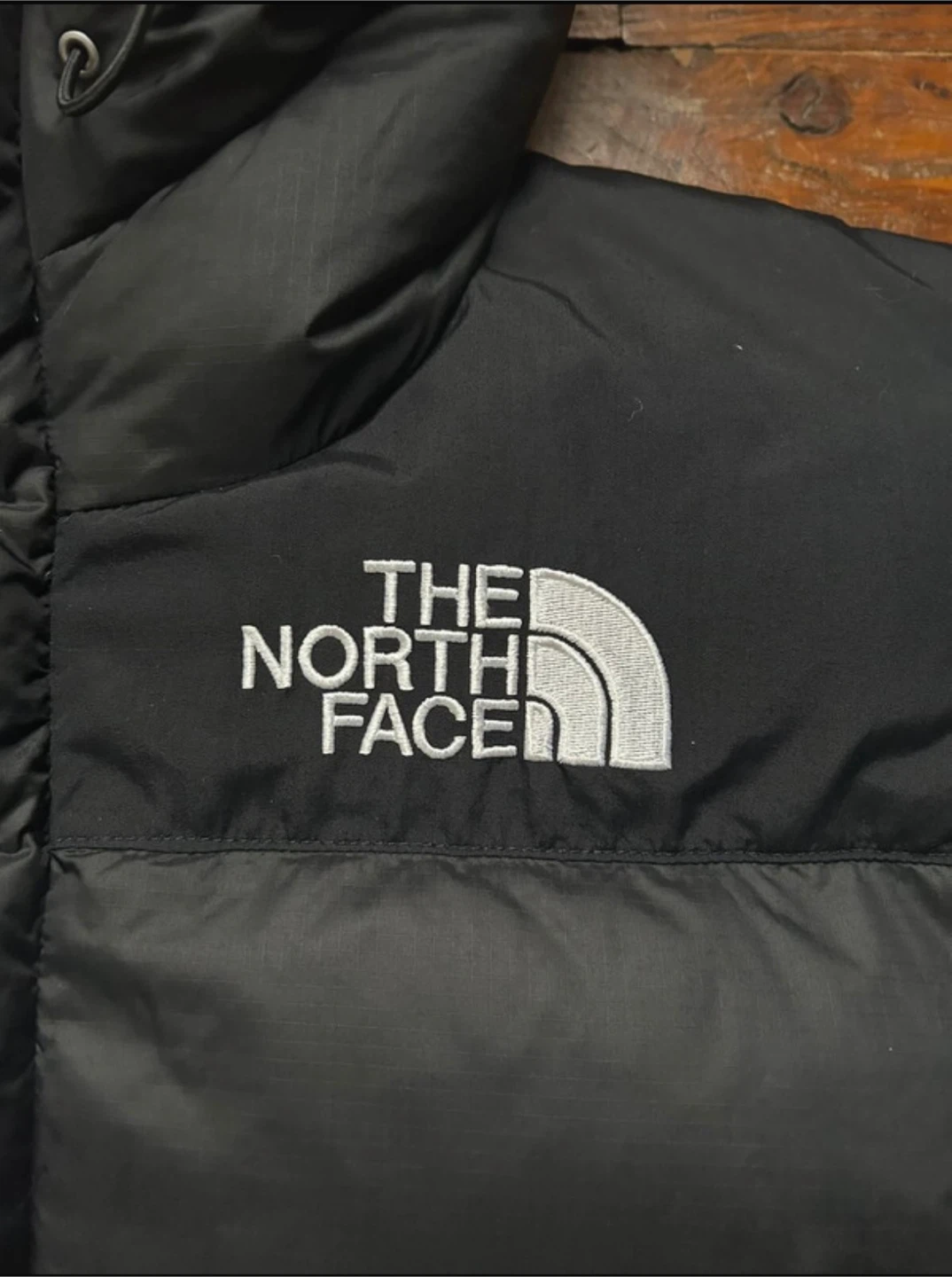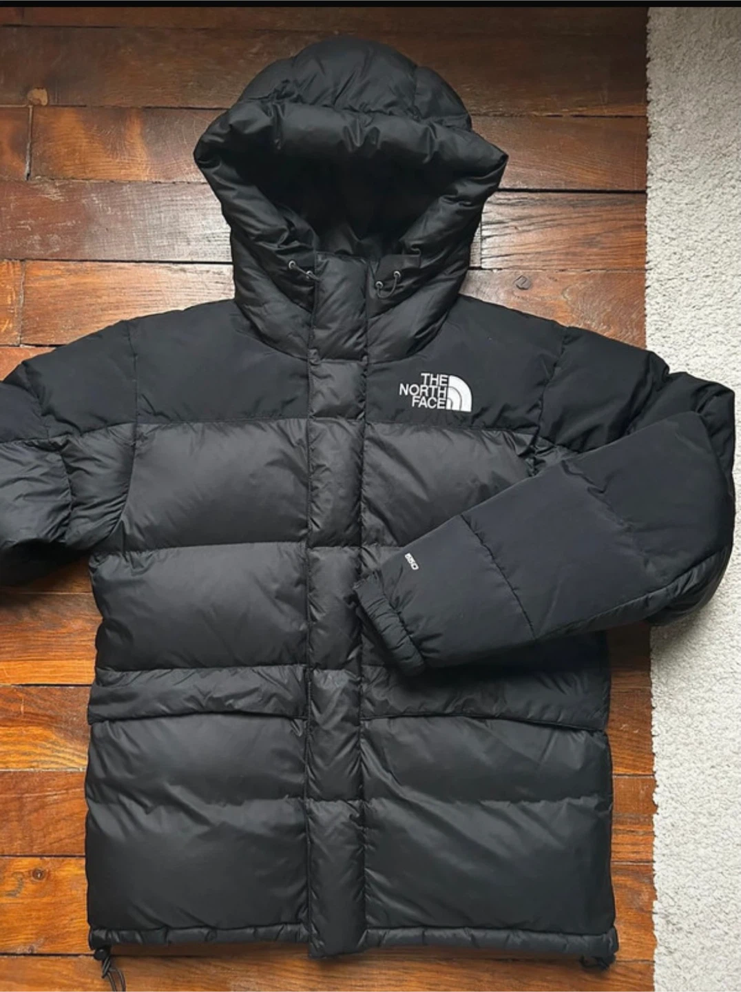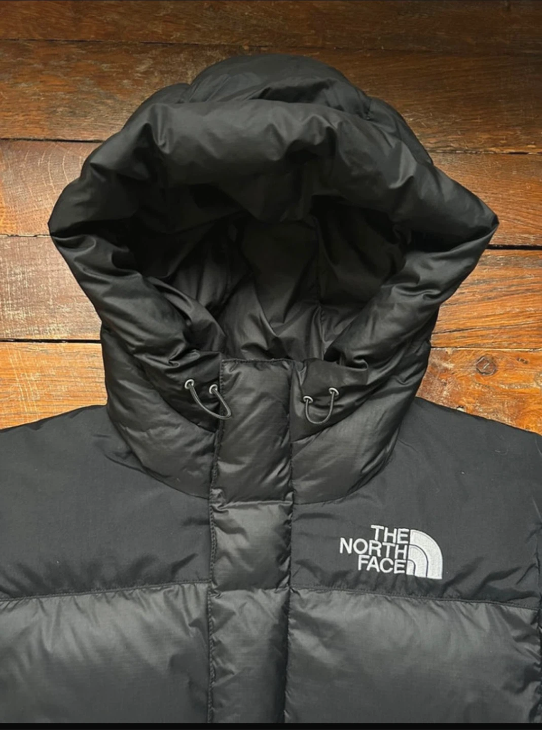 This is a black puffer jacket from The North Face. It features a full zip closure and an attached hood for extra warmth. The jacket is made with durable materials and is built to last.