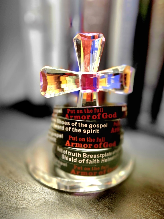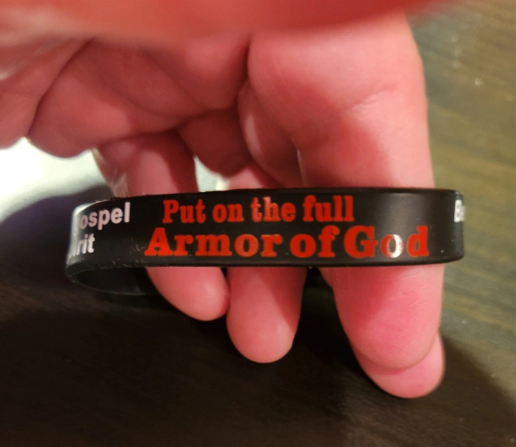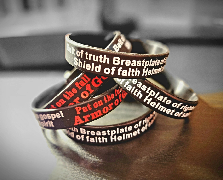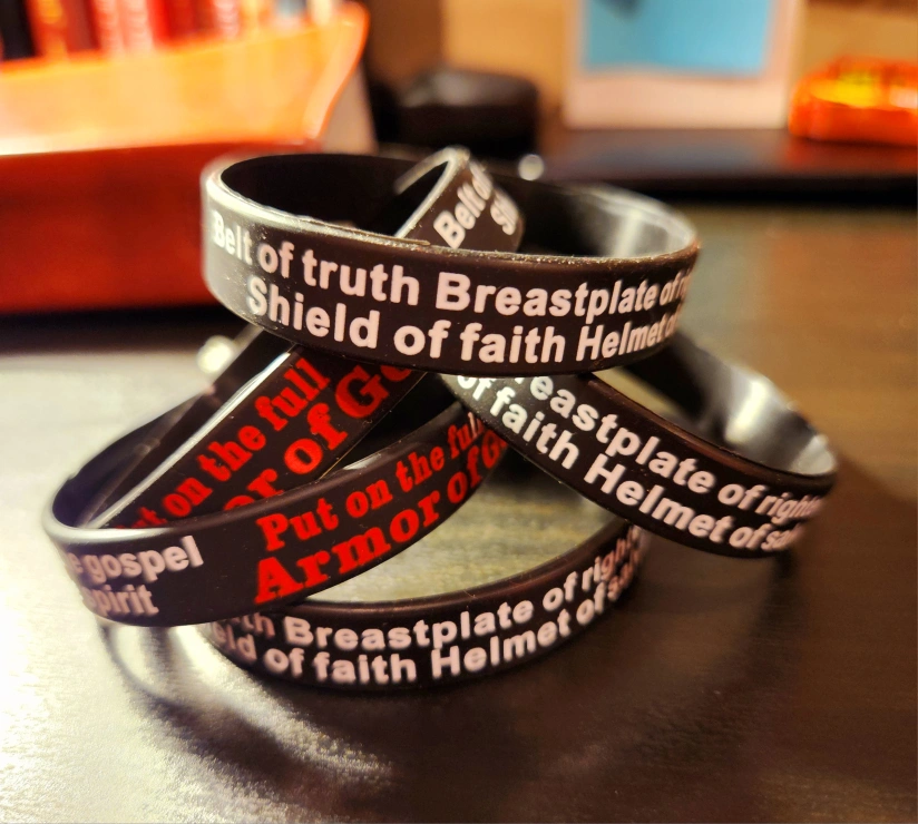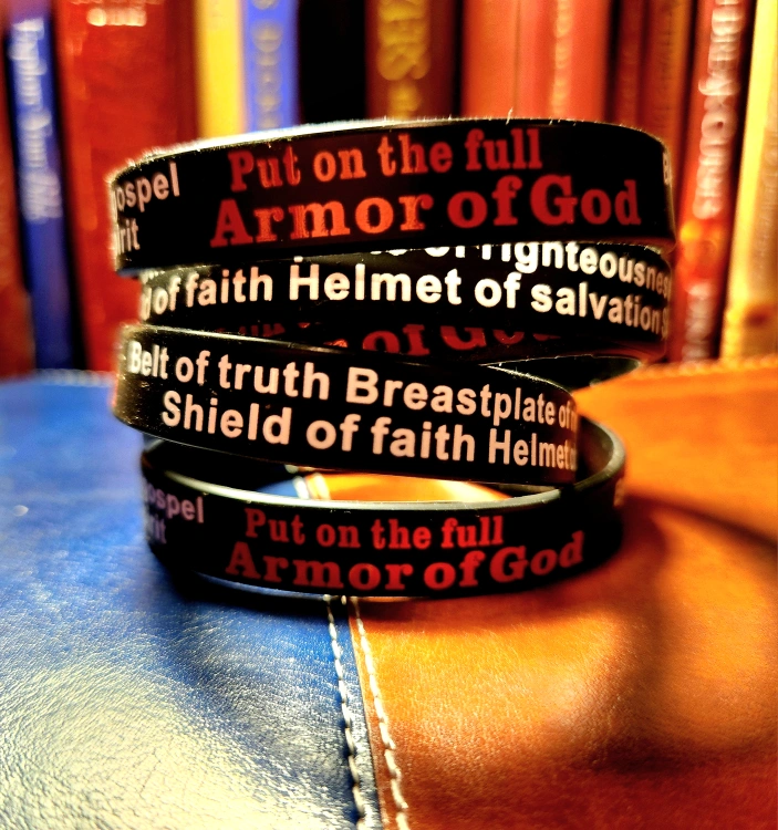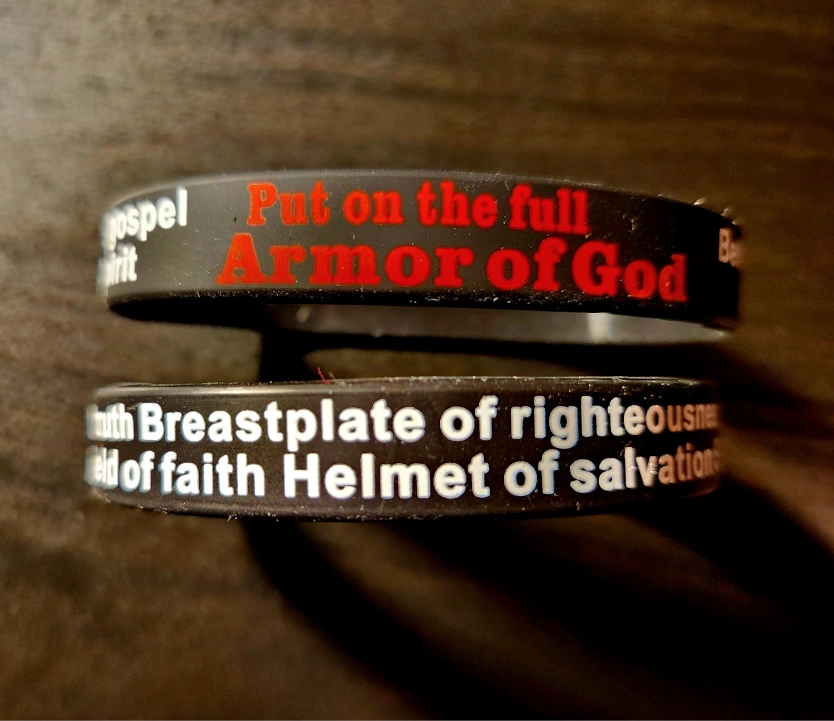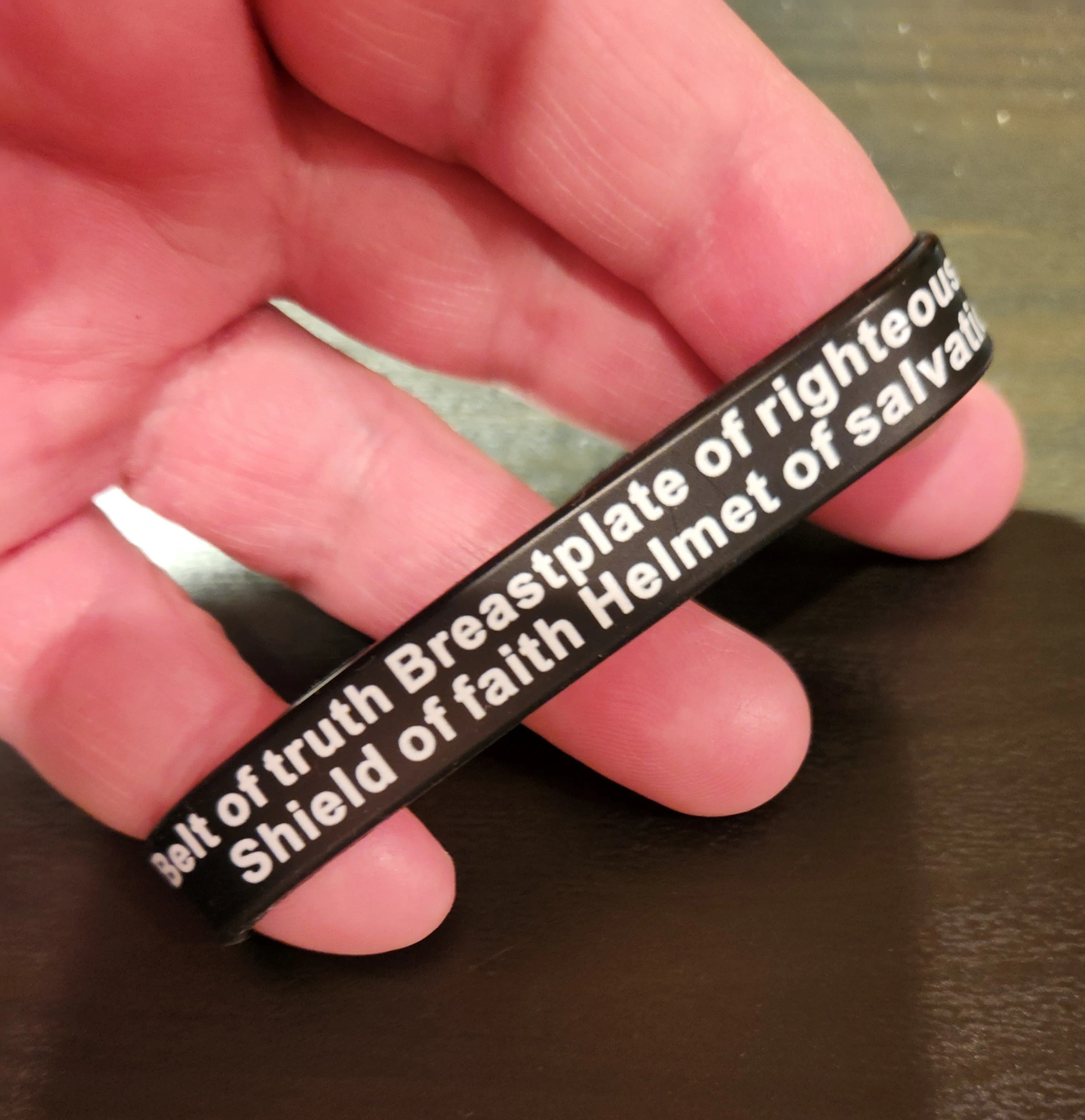 THESE NEW Scripture Bracelets are a set of 5 black silicone wristbands with white and red lettering. Each is $1. Each band says, "Put on the full Armor of God," and then includes a different part of the armor like "Belt of truth," "Breastplate of righteousness," etc.