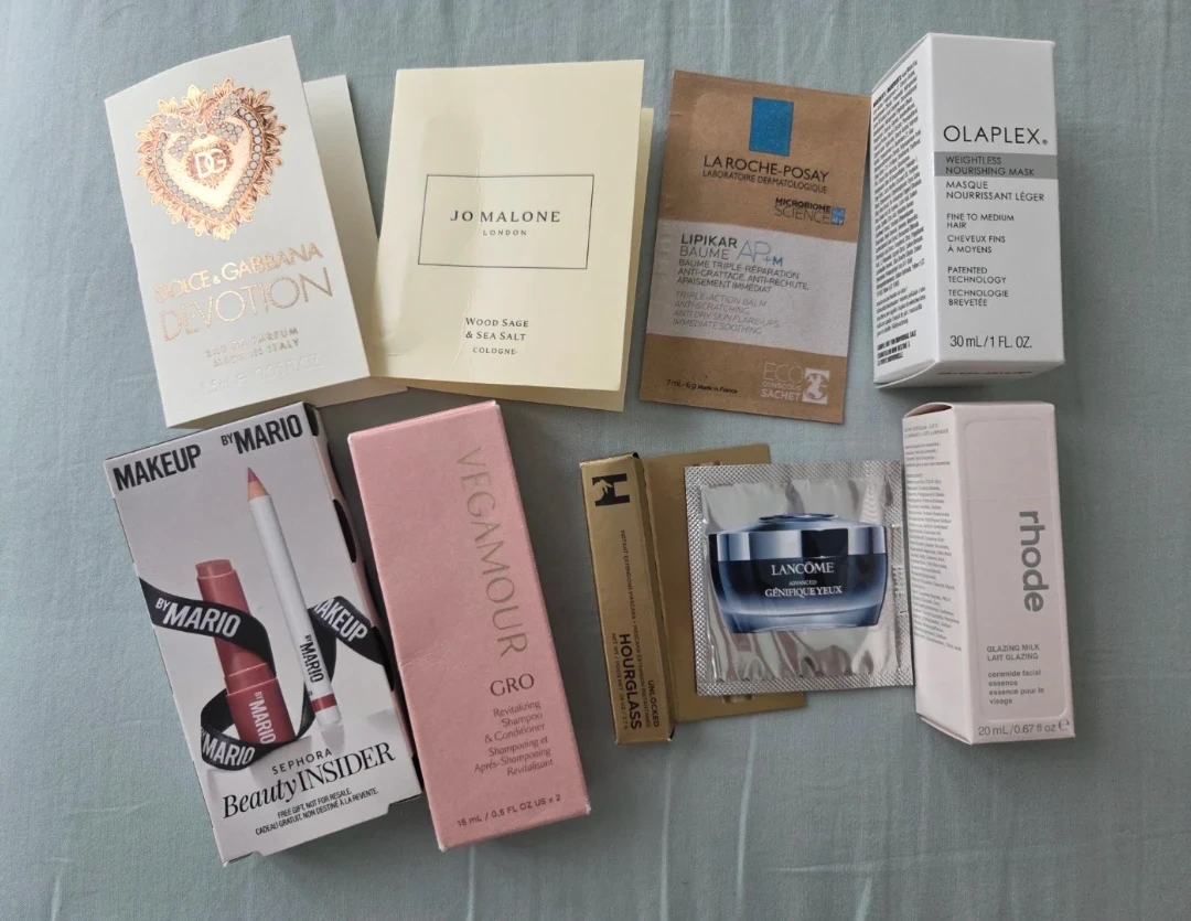 Samples include Lancôme Génifique Yeux, Jo Malone cologne, La Roche Posay and Dolce & Gabbana perfume.