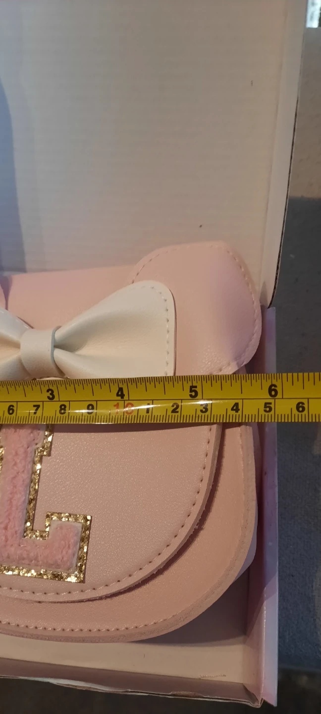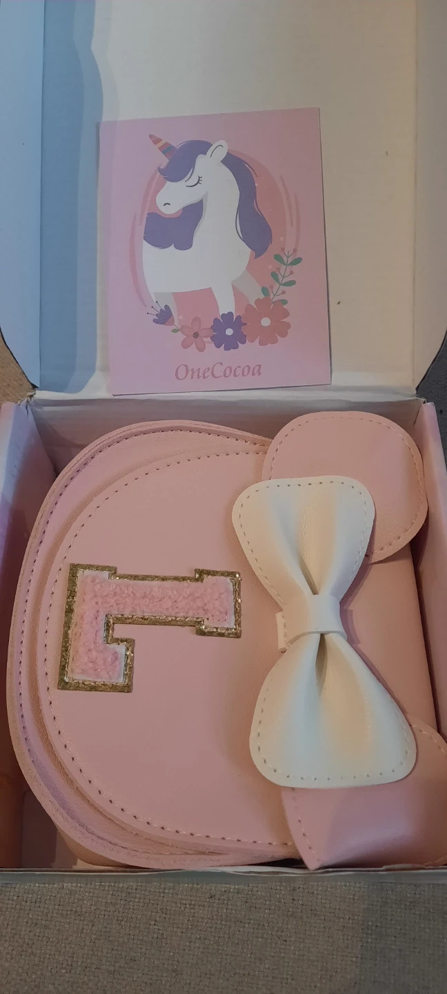 This cute pink toddler purse features a large chenille 'L' with gold glitter trim and a white bow. It's designed with mouse ears and has a faux leather finish. A small booklet with a unicorn design is also included. The purse's approximate width is 5 inches. Comes with a strap to make it a crossbody!