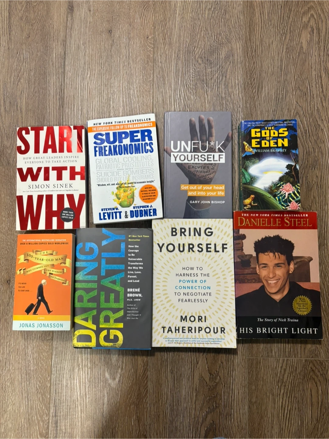 Selling a lot of 8 books including "Start With Why" by Simon Sinek and "Super Freakonomics" by Levitt & Dubner. Titles also include "Unf*ck Yourself", "The Gods of Eden", "The 100-Year-Old Man", "Daring Greatly", "Bring Yourself", and "His Bright Light". All books are in good condition.
