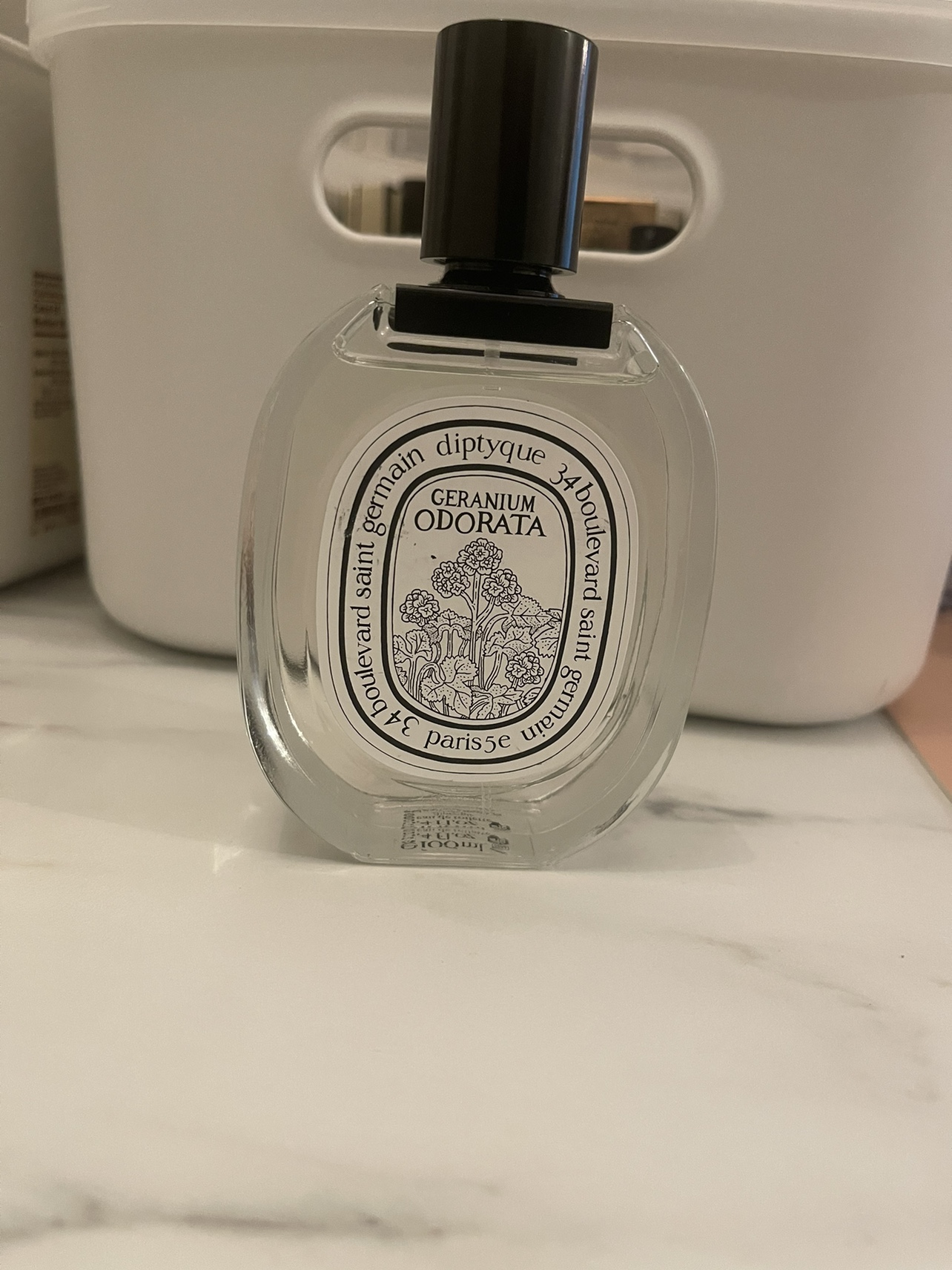 A bottle of Diptyque Geranium Odorata perfume. The bottle is approximately 3.4 oz in size. It's a unisex scent.
