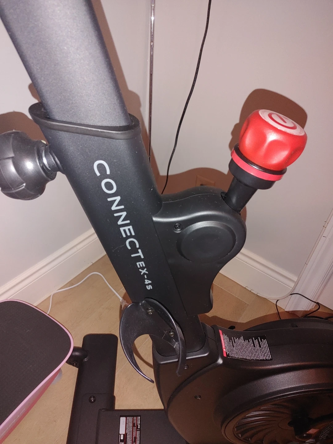 Echelon Connect EX-45 exercise bike with adjustable resistance knob. Features adjustable seat and handlebars. Includes toe cages on pedals.