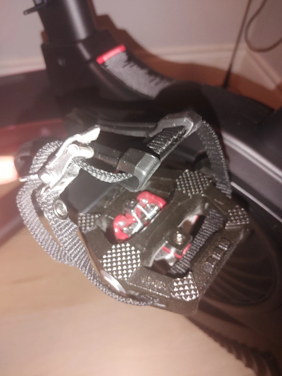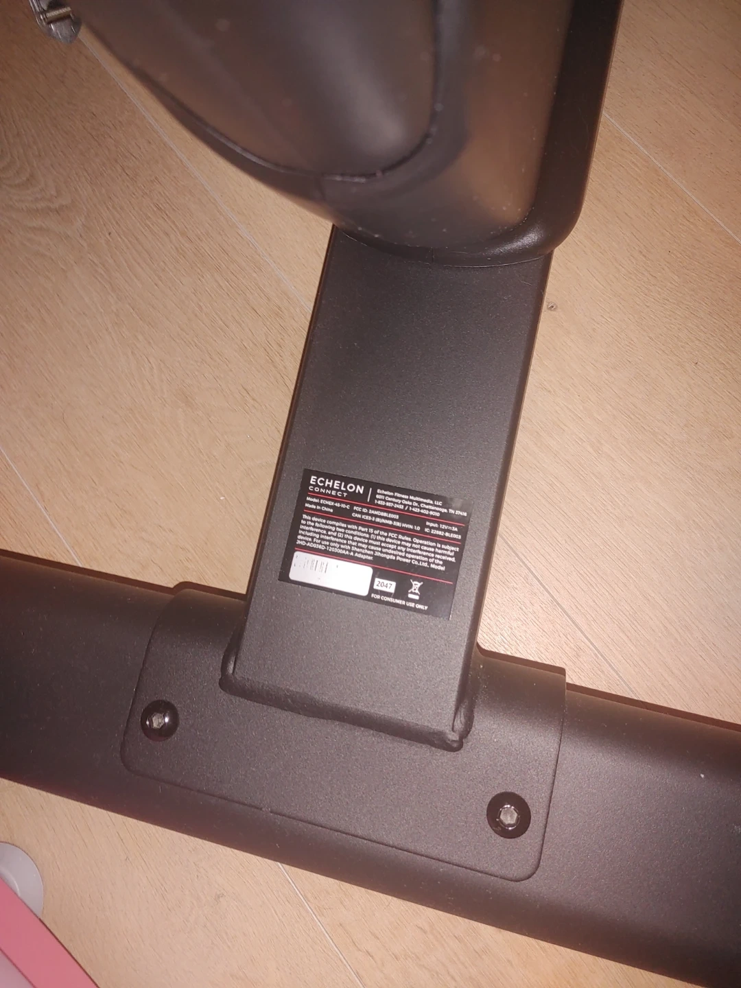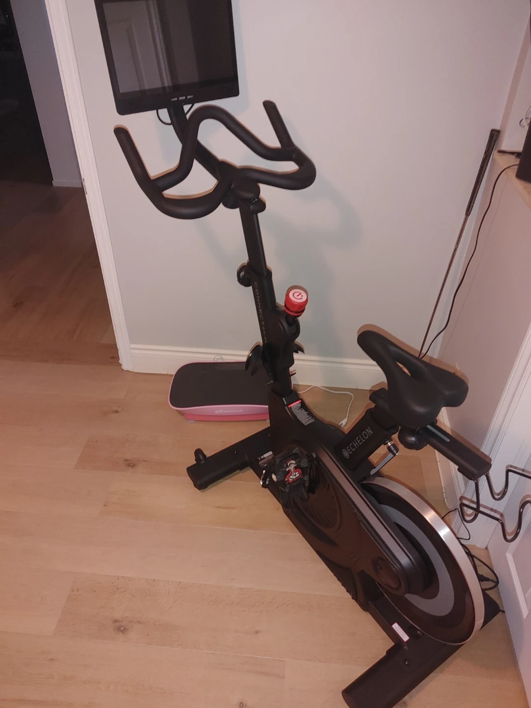 Echelon Connect EX-45 exercise bike with adjustable resistance knob. Features adjustable seat and handlebars. Includes toe cages on pedals.