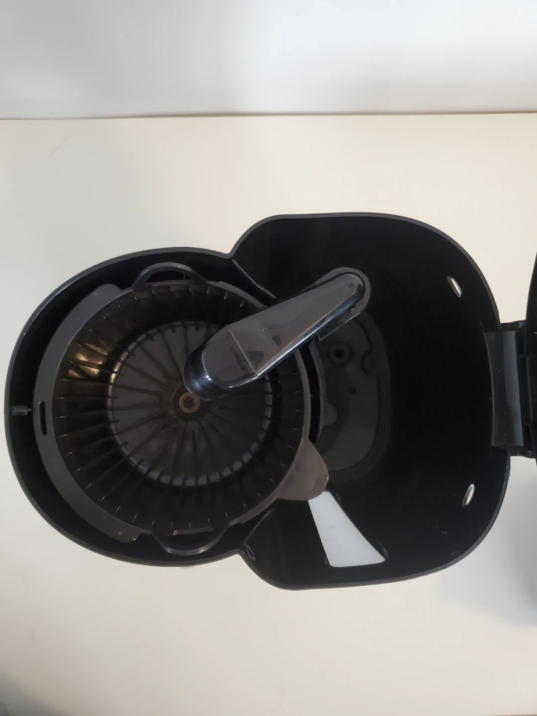 Black Sunbeam coffee maker with a 12-cup capacity. Includes a glass carafe and a reusable filter basket. It's ready to brew your morning coffee!