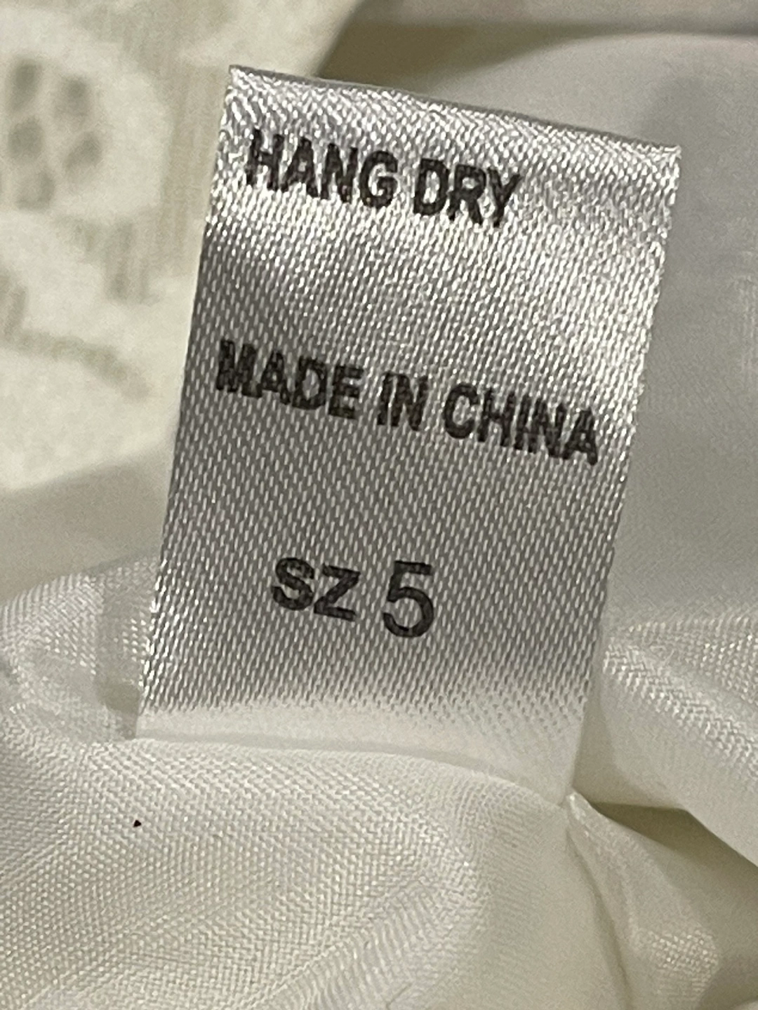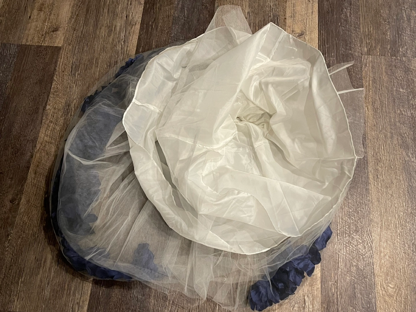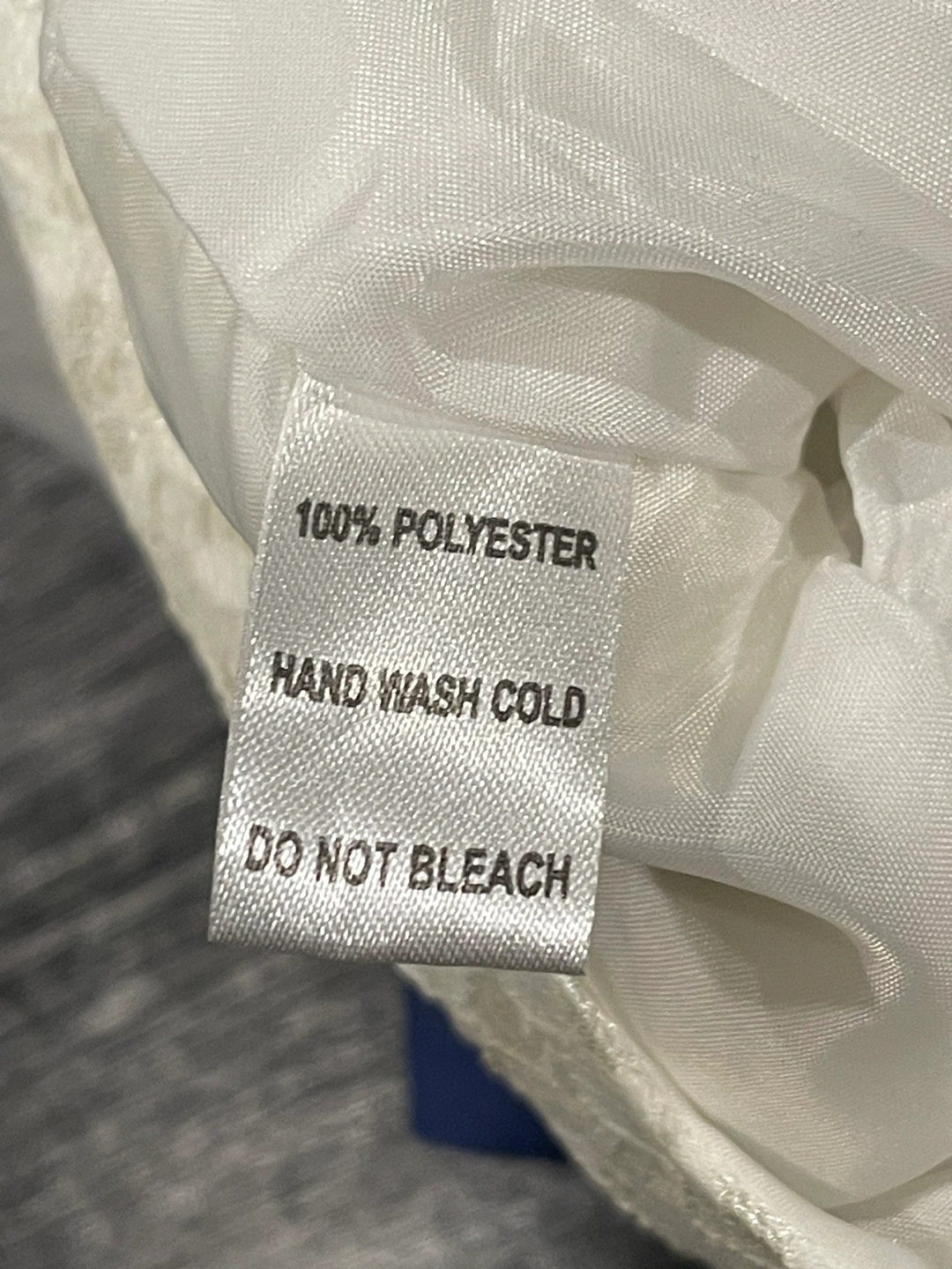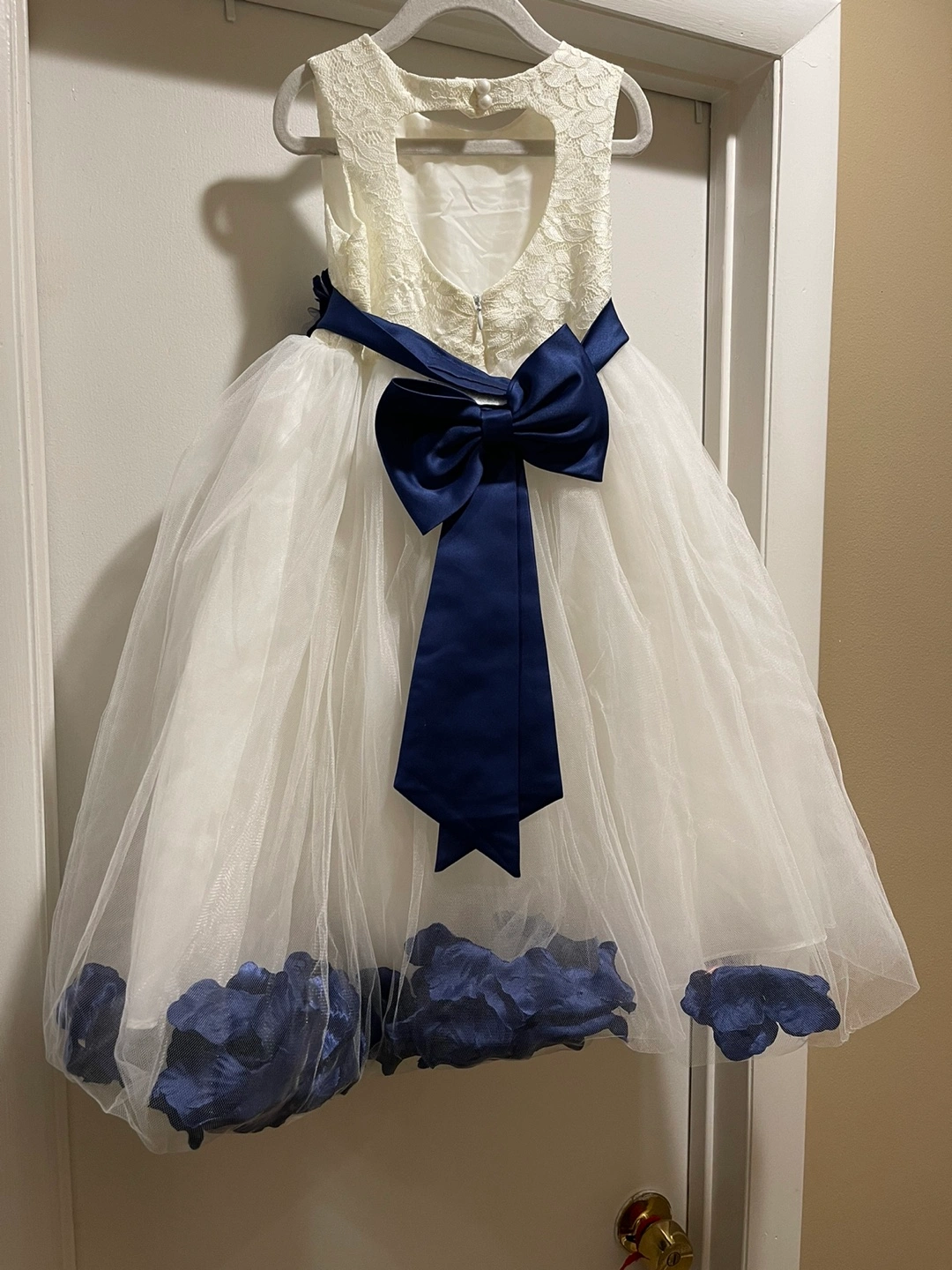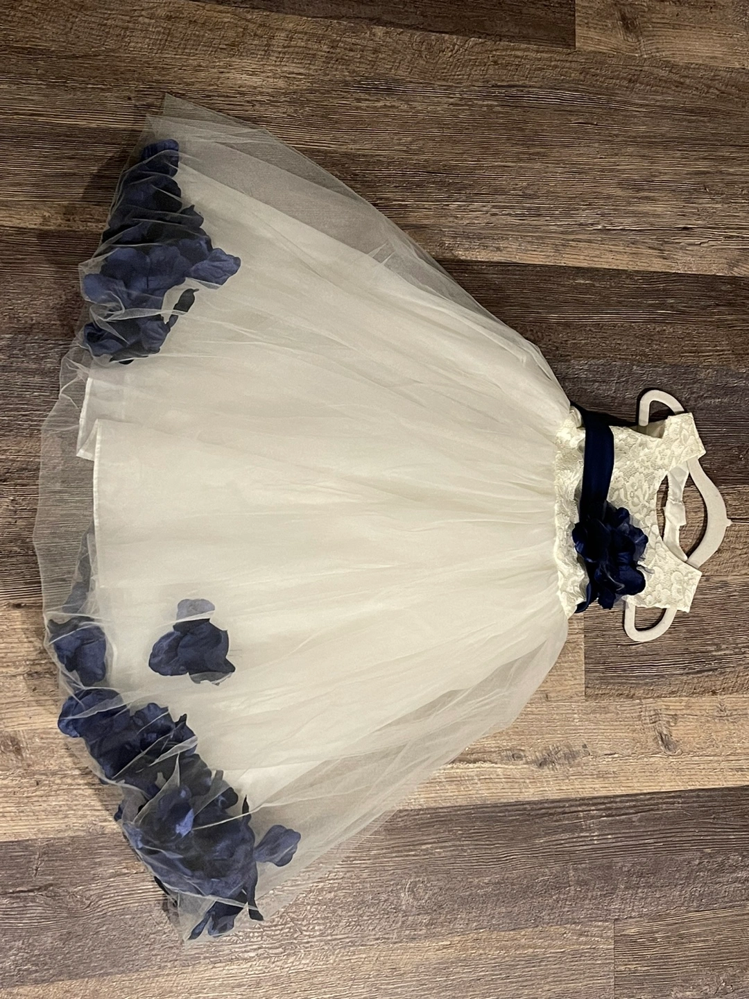 White lace dress with blue ribbon and blue flower accents. Tulle skirt with blue flower trim. Back zipper closure.